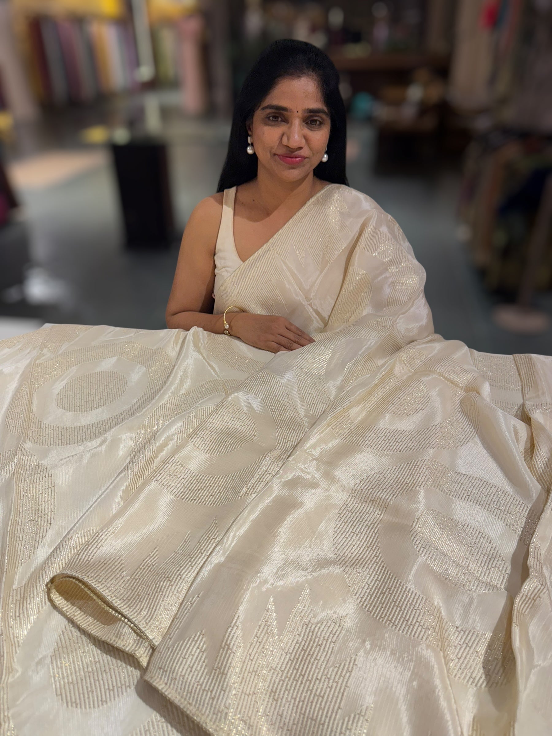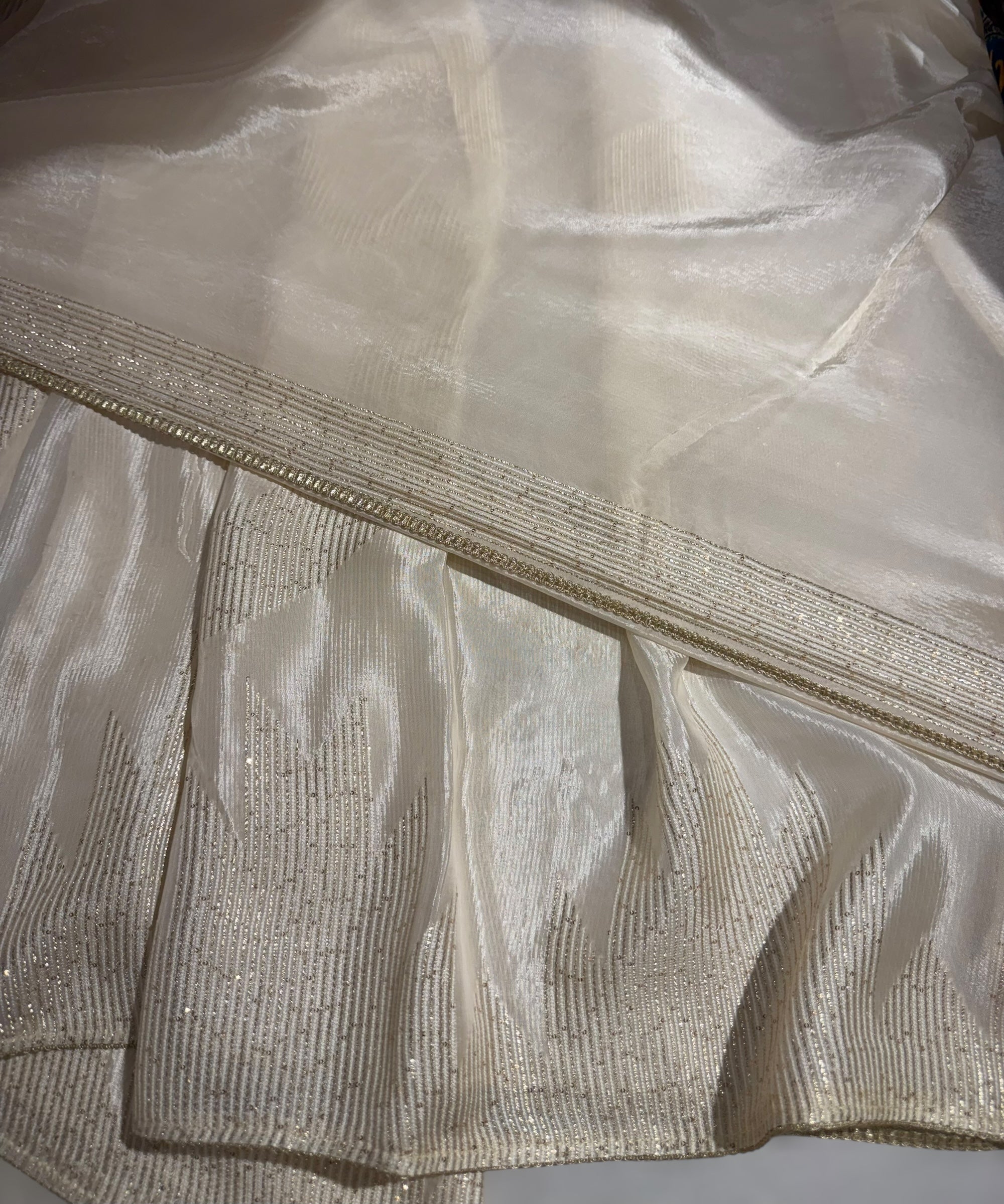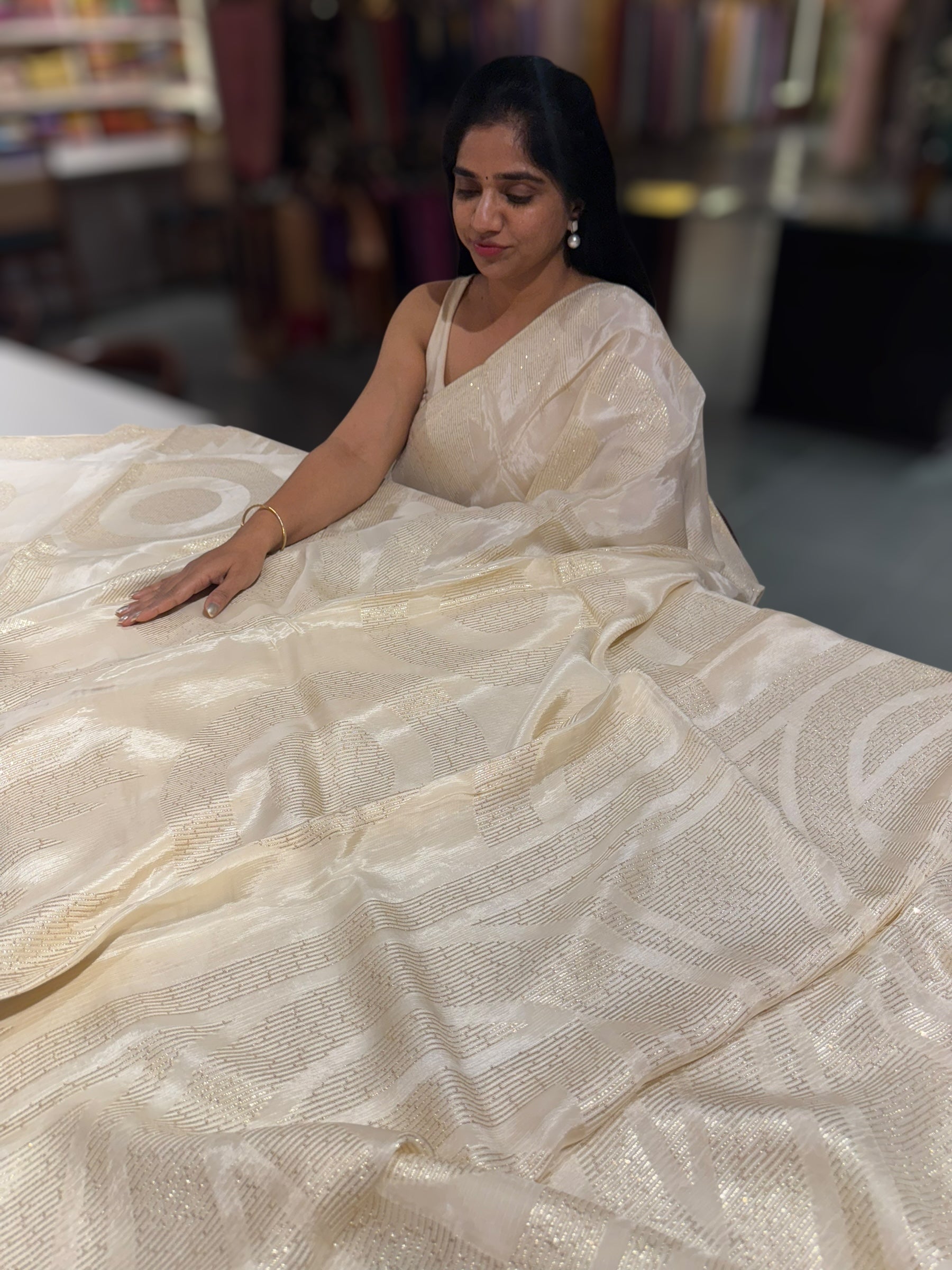 Ivory pure chinnon saree with allover thread and sequin work paired with self blouse and designer printed blouse
