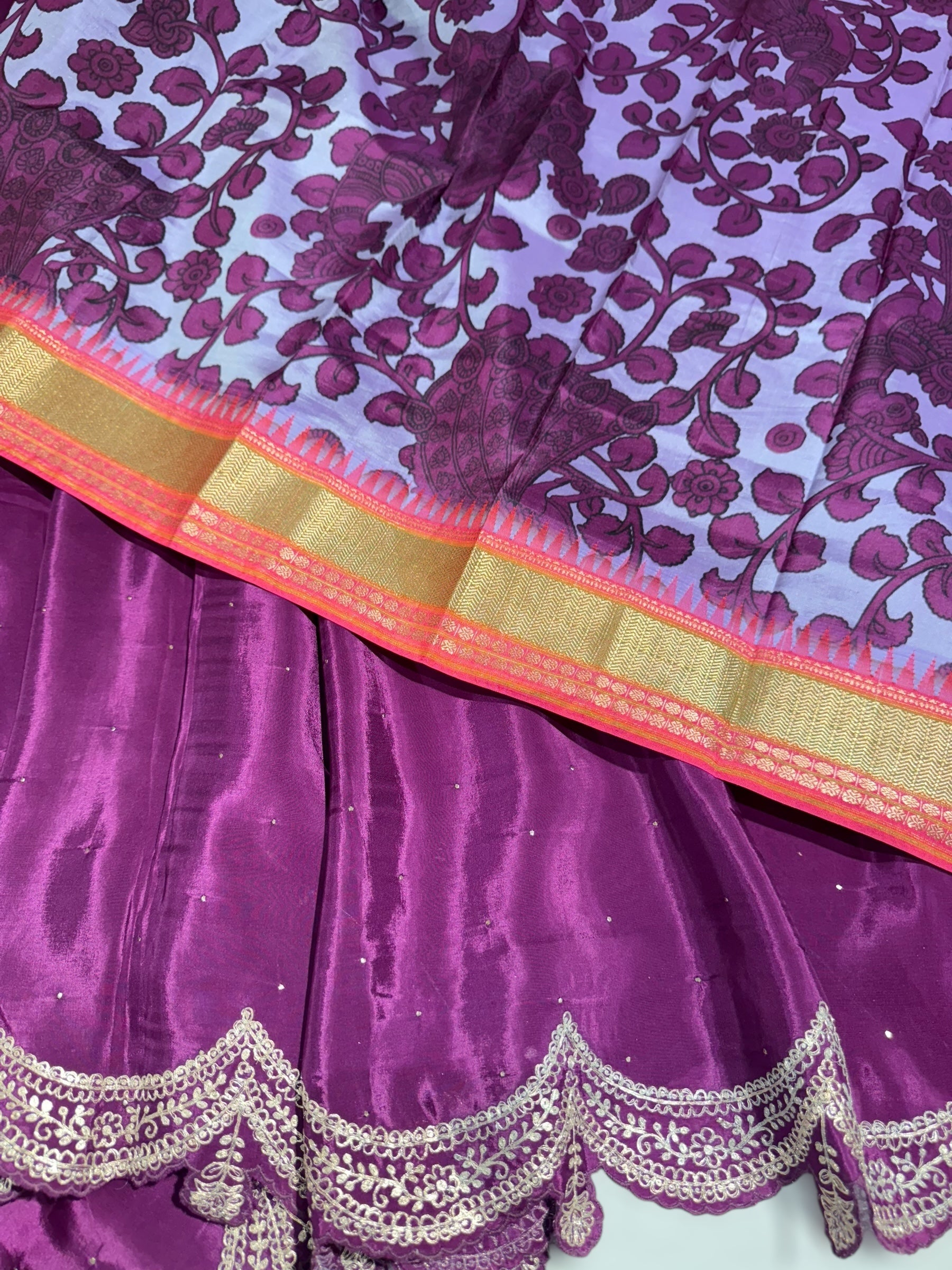 wine pure crepe silk saree with heavy scalloped pita work border paired with Pure kanchi Silk kalamkari printed blouse