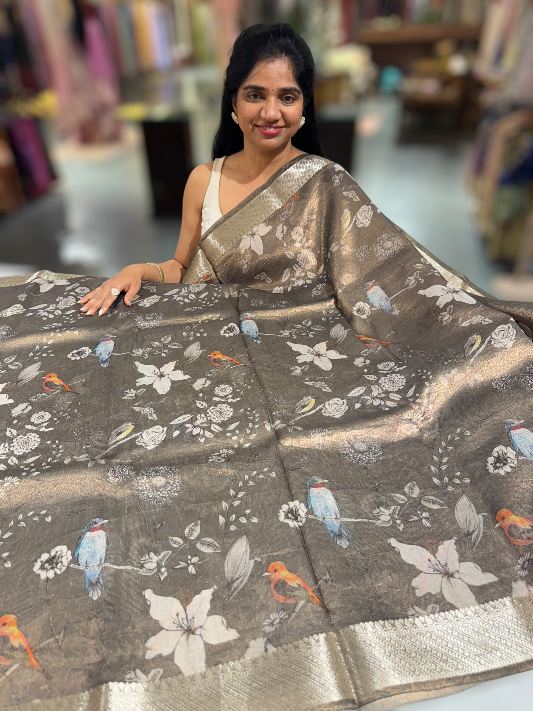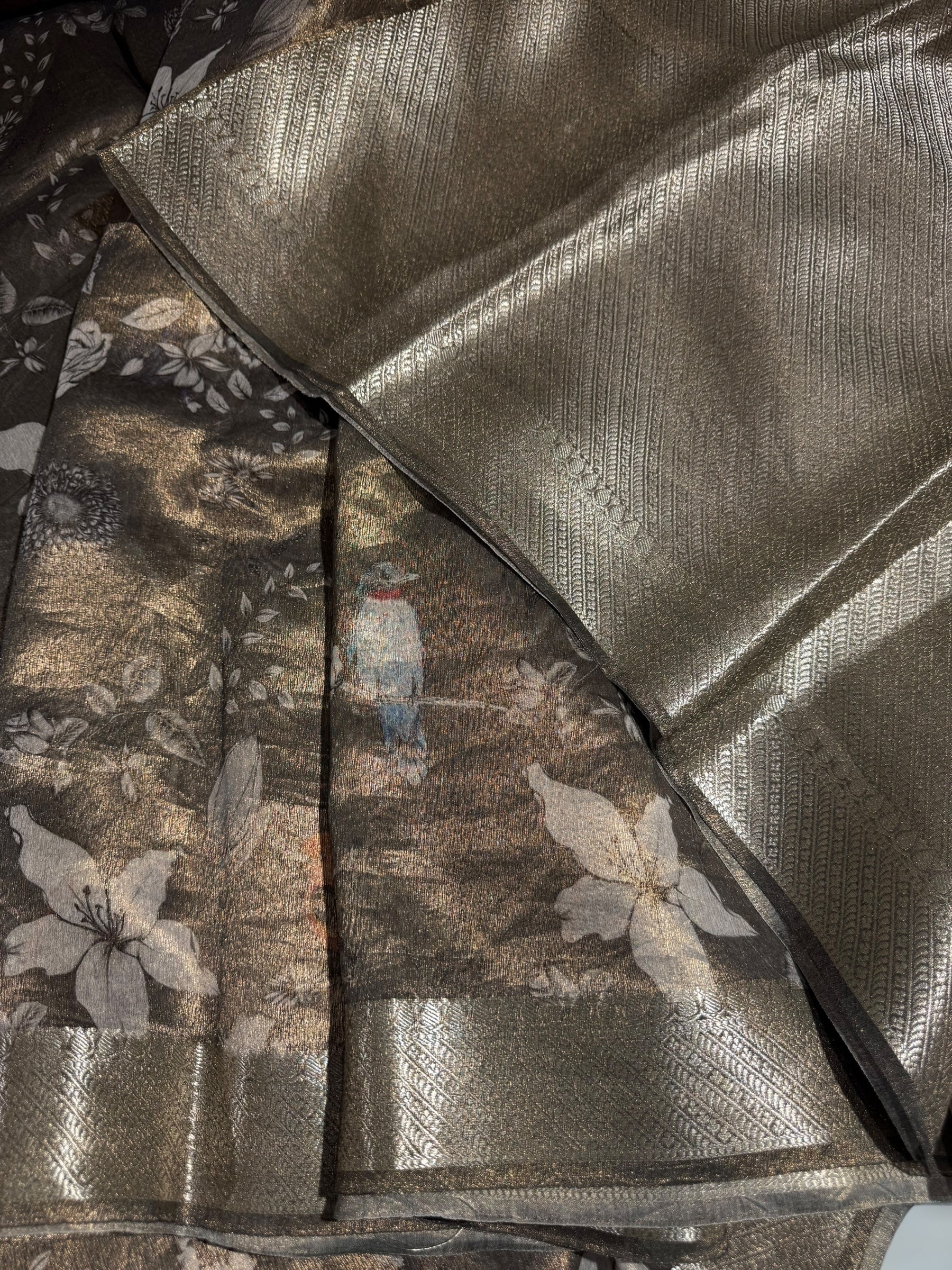 Pure handloom floral -printed Banarasi cotton tissue saree, beautifully complemented with rich brocade borders and pallu. Comes paired with a matching brocade blouse