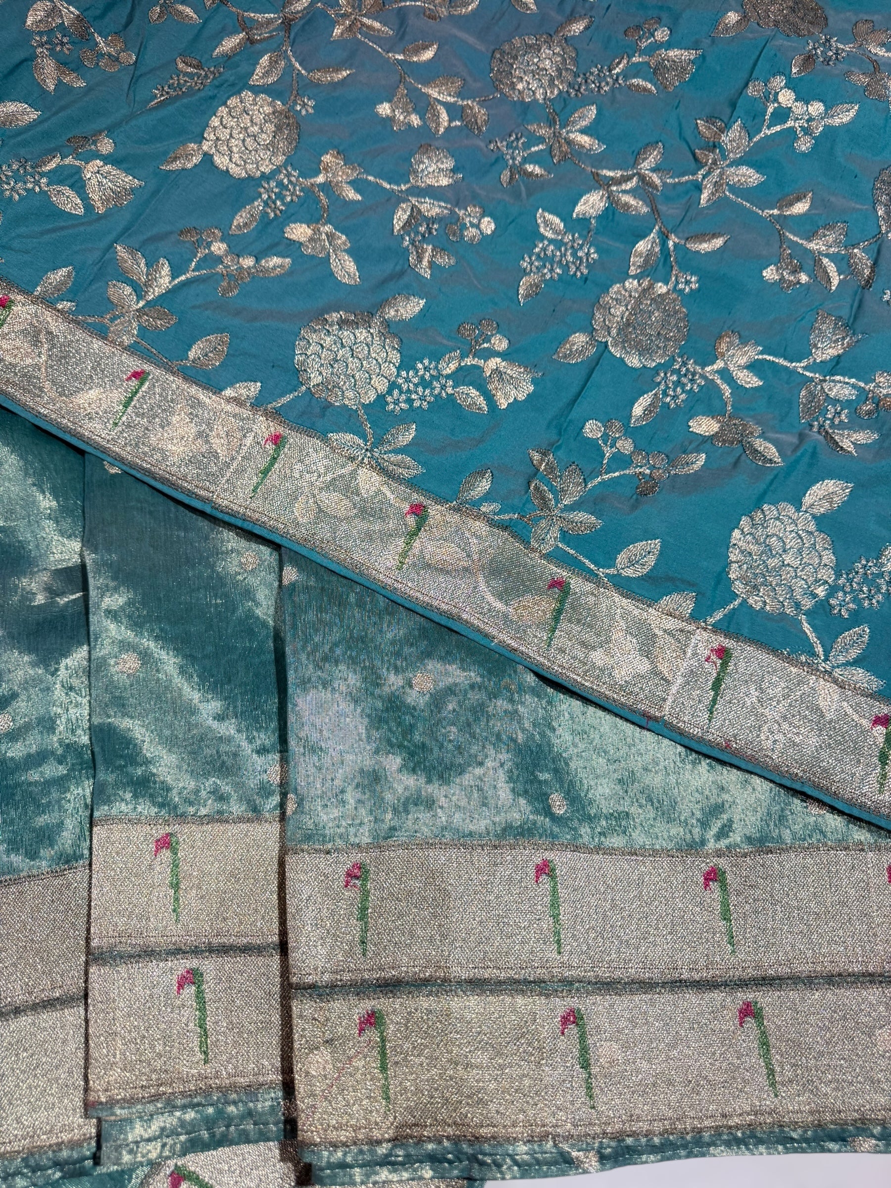 Ruby Pink Tissue Saree featuring an embroidered single muniya tissue border on the top and a double muniya border on the bottom and pallu, paired with an elegant allover embroidered blouse.