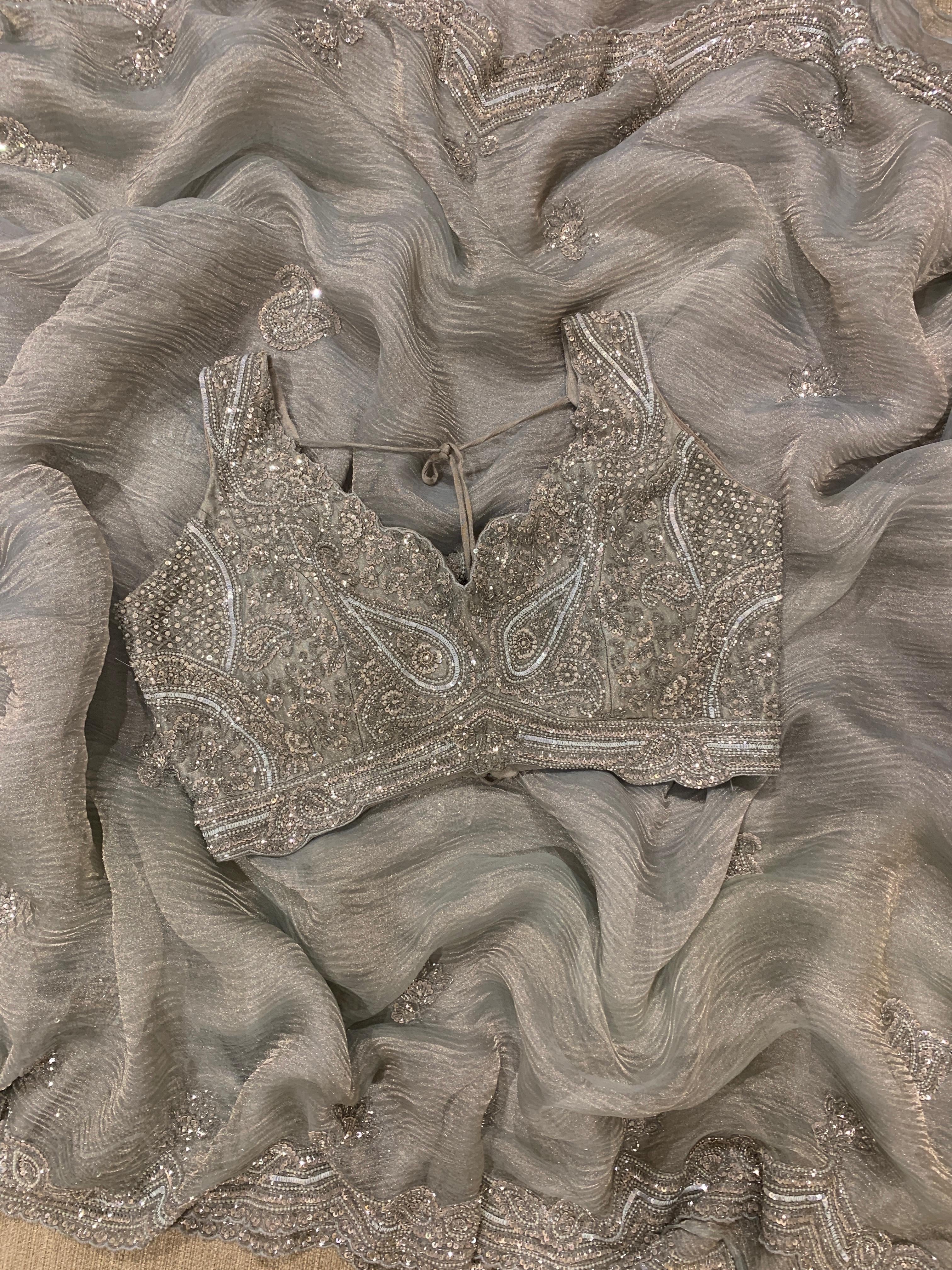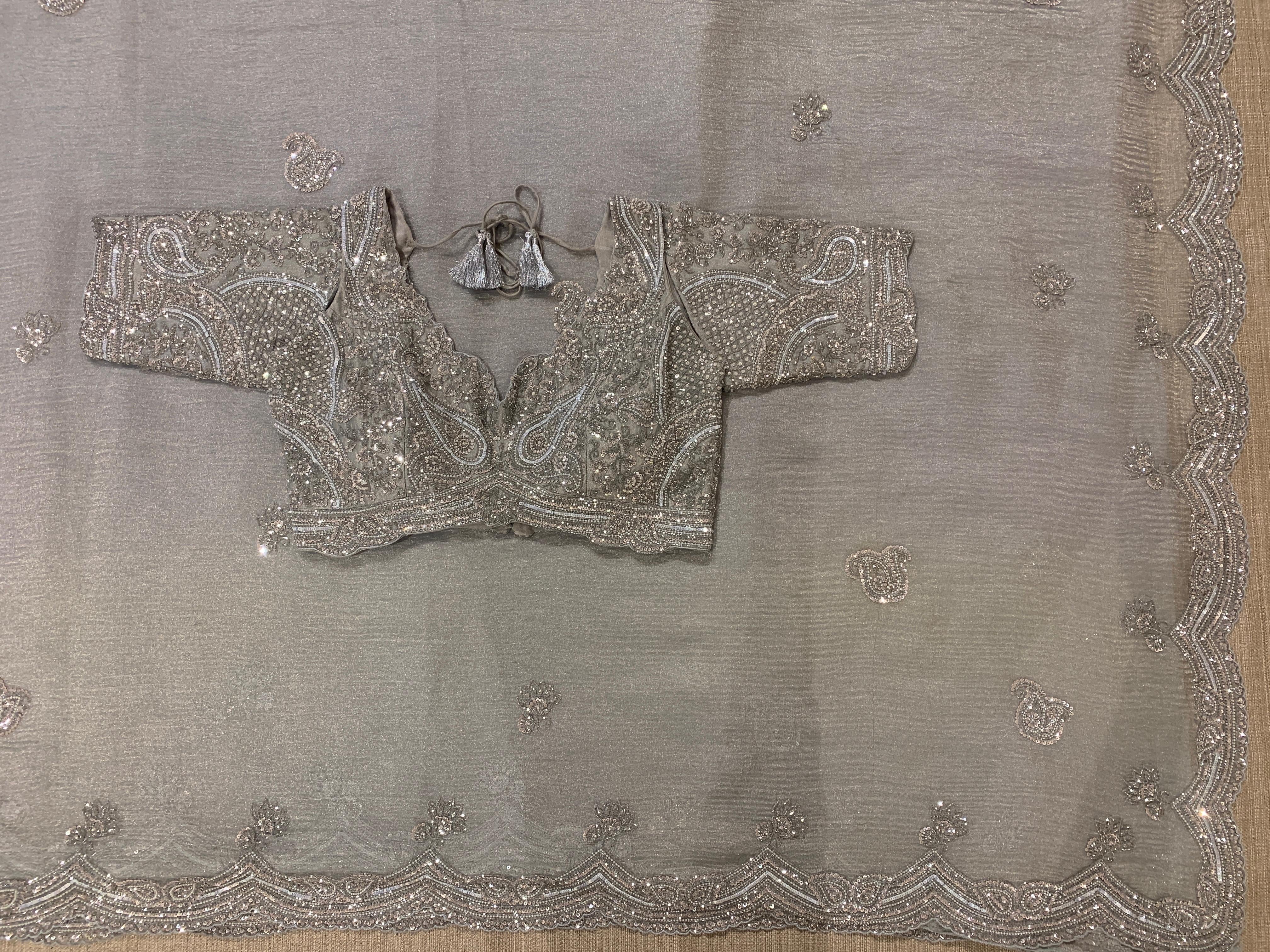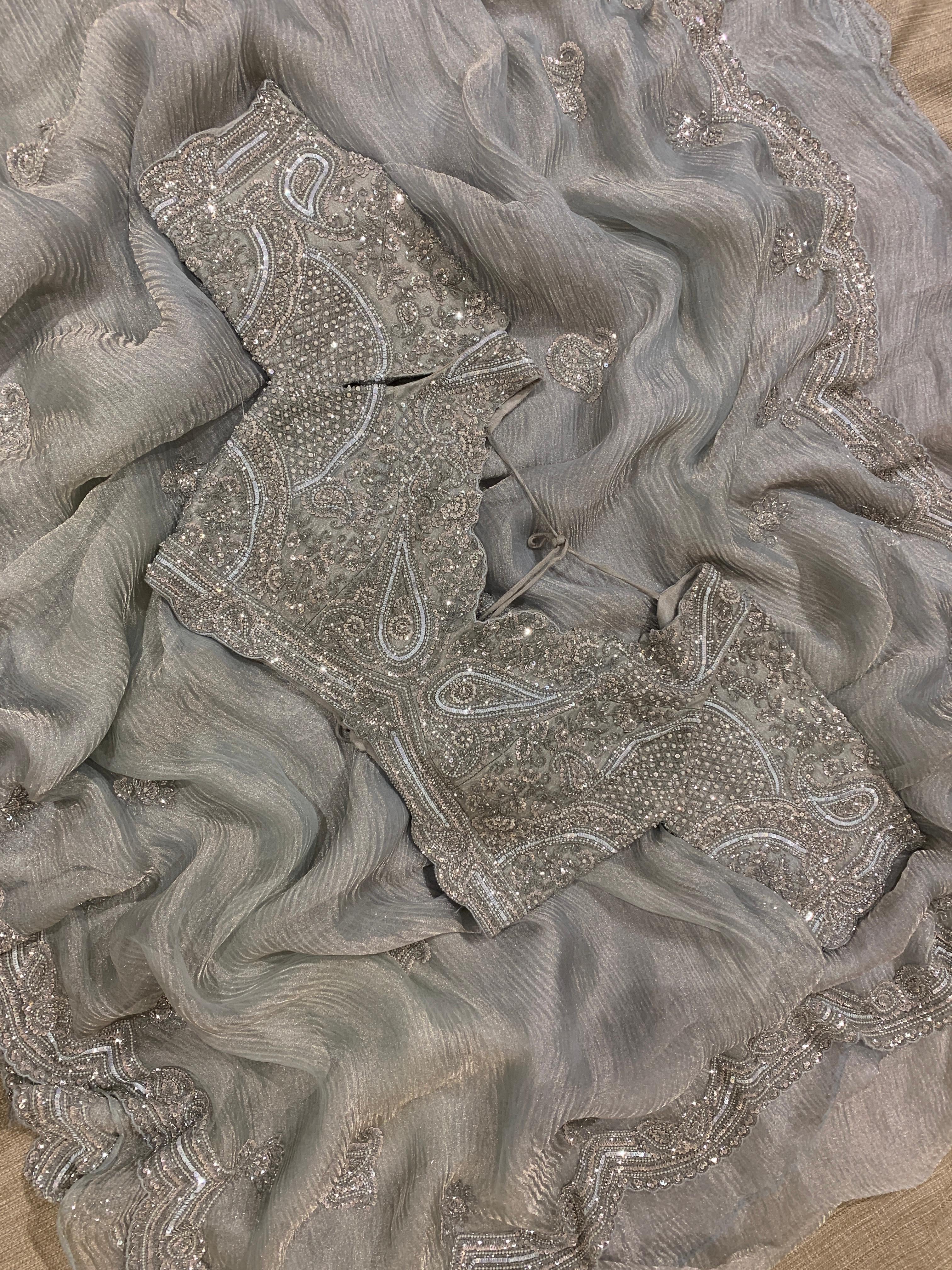 Exquisitely crafted premium handloom lightweight silver tissue saree featuring elegant kora borders, pallu, and blouse. The saree body is adorned with allover convent/ petite point embroidery with floral creepers ans butterflies.