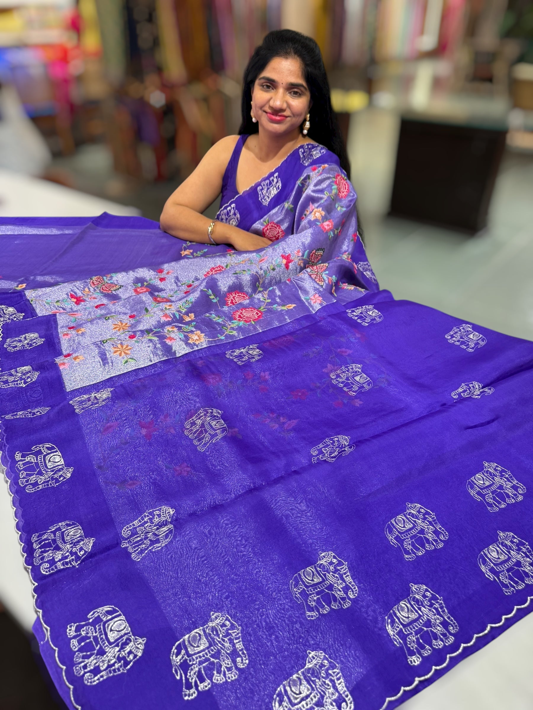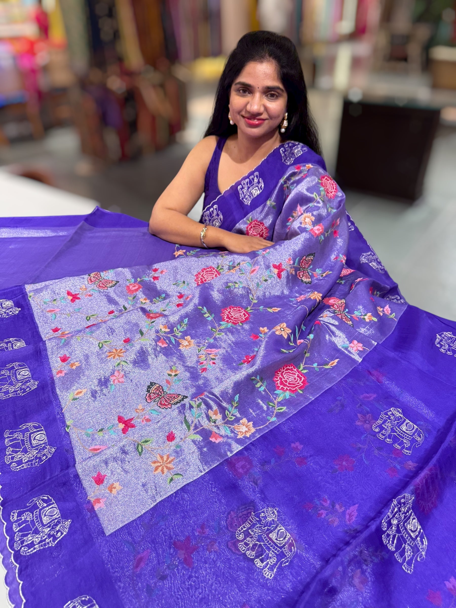 Exquisitely crafted premium handloom lightweight silver tissue saree featuring elegant kora borders, pallu, and blouse. The saree body is adorned with allover convent/ petite point embroidery with floral creepers ans butterflies.