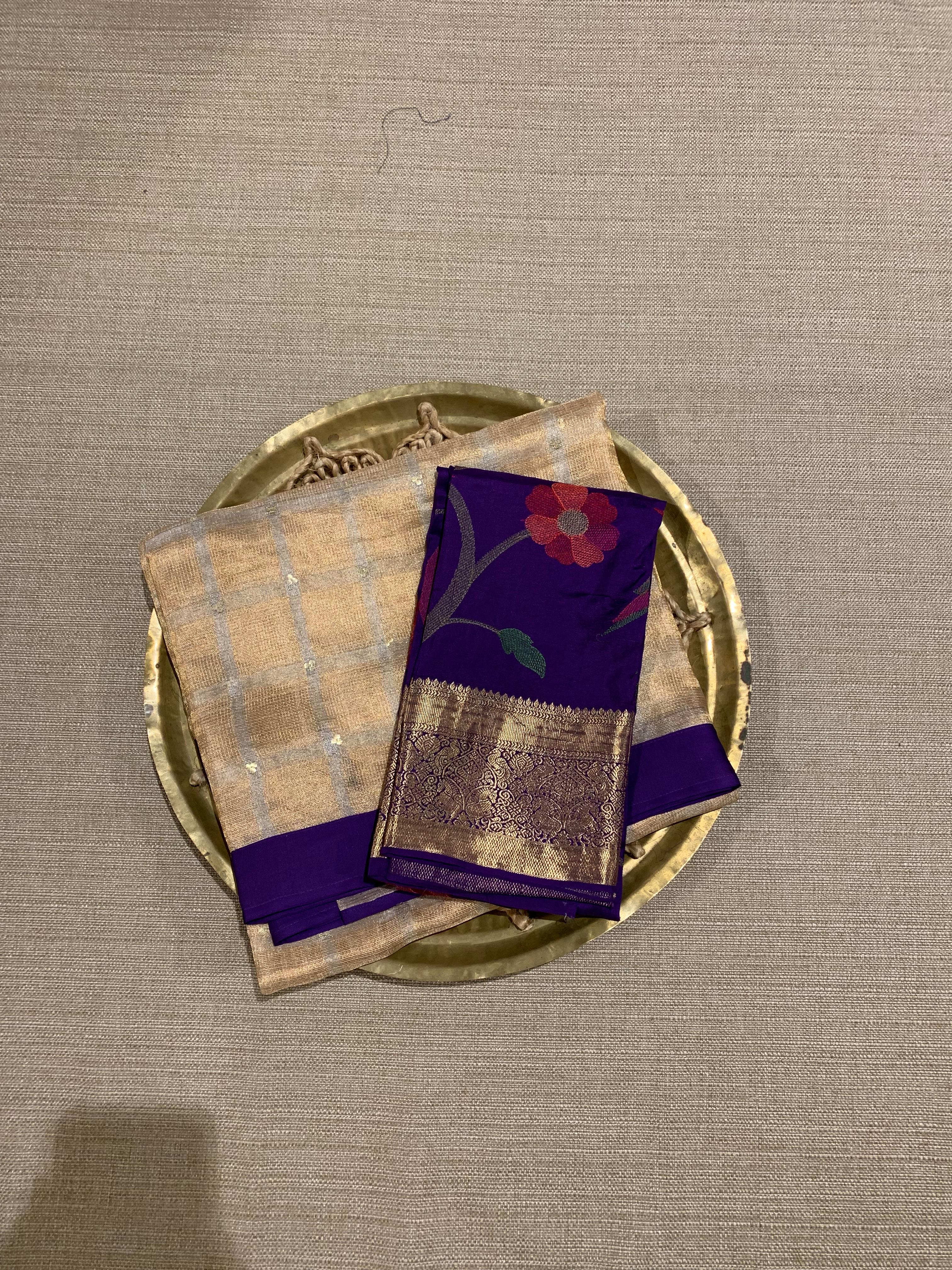 Golden tissue saree with silver checks pattern hemlined with red satin border and embedded sequence woven in the saree.
