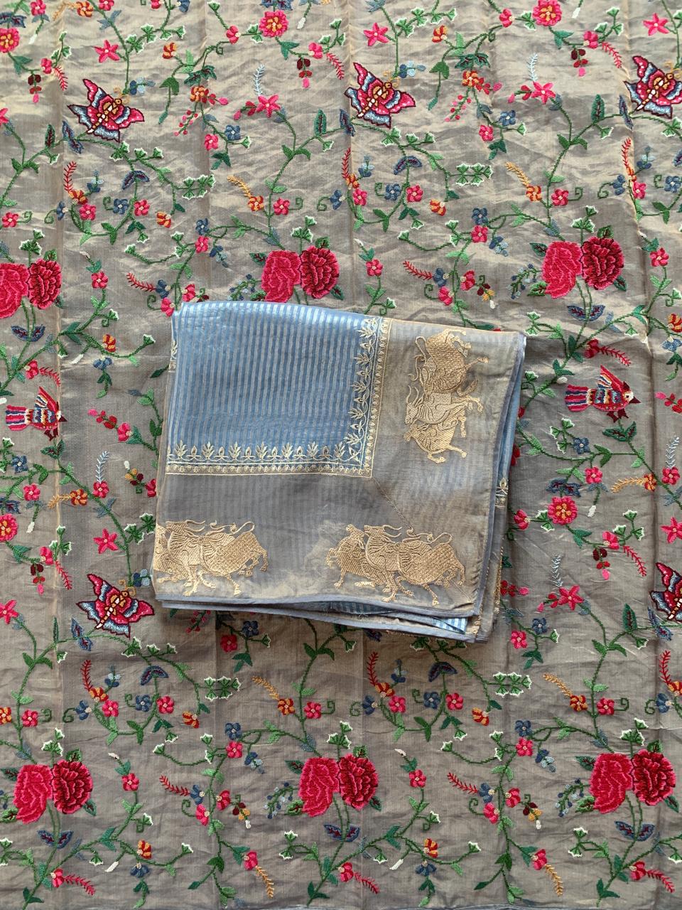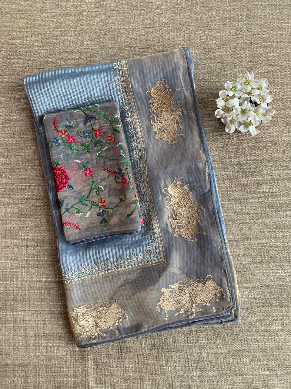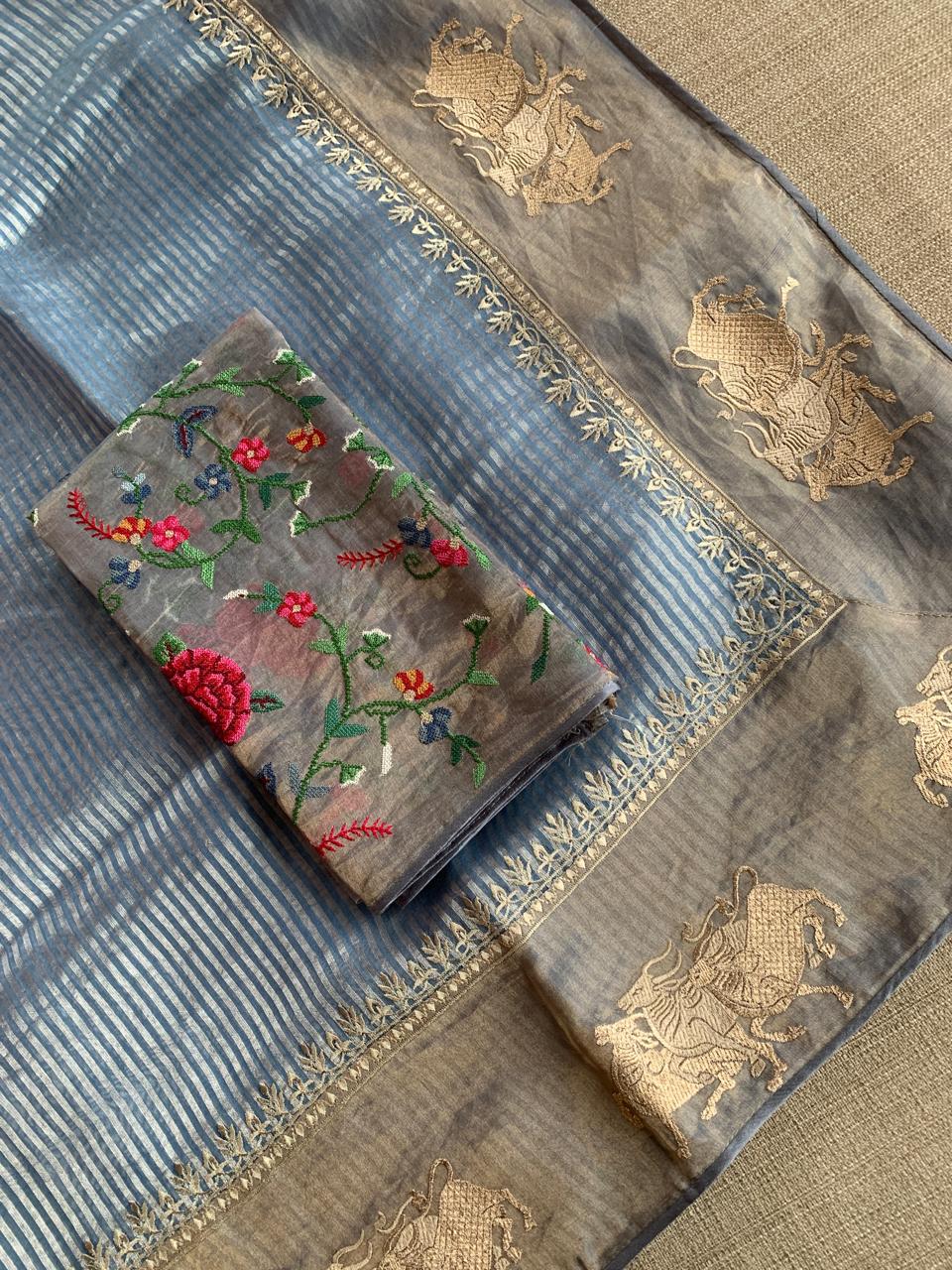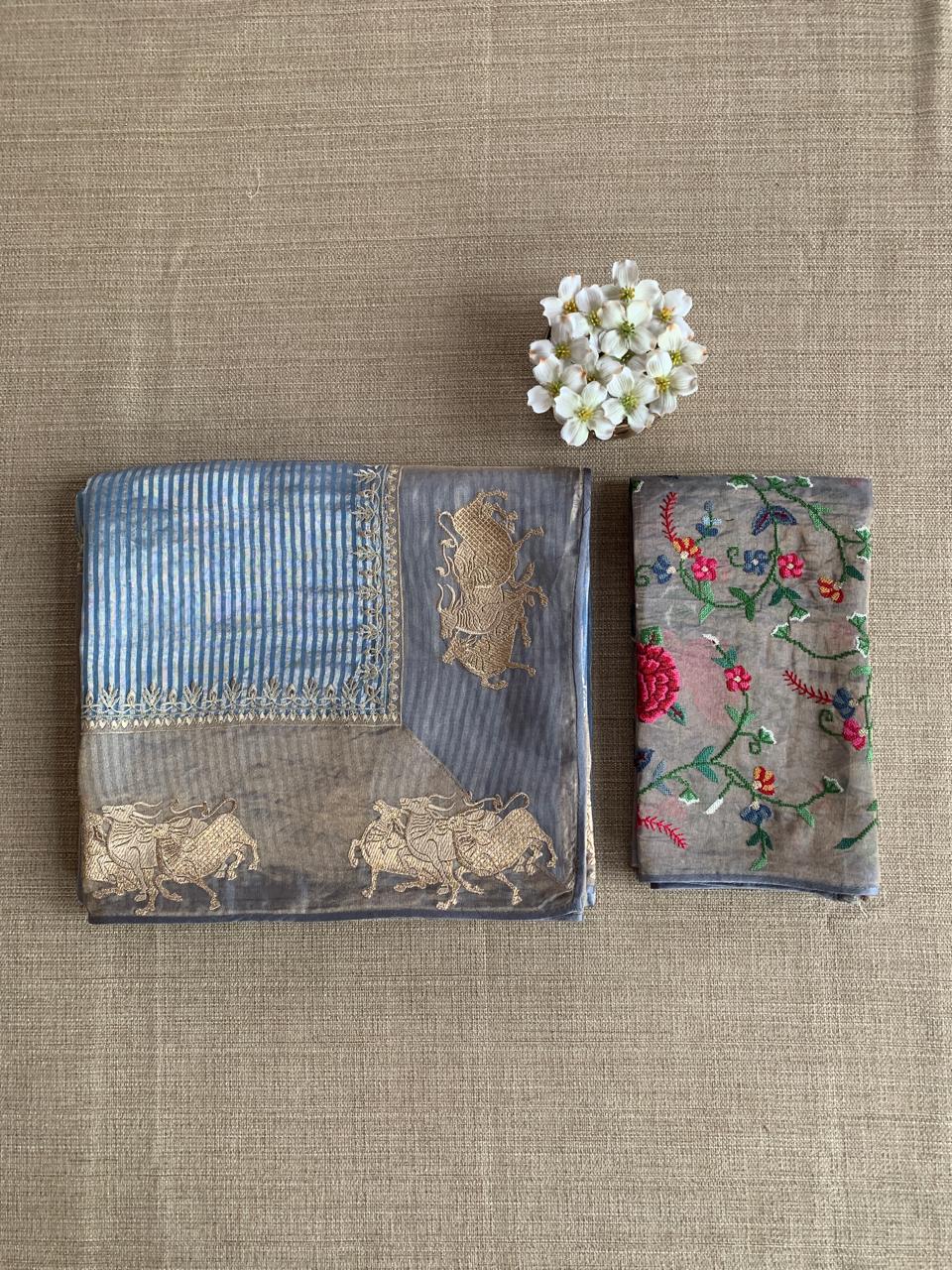 • Evening Sky Tissue Stripes Saree with Nandi Border & Tissue Petite Point Blouse