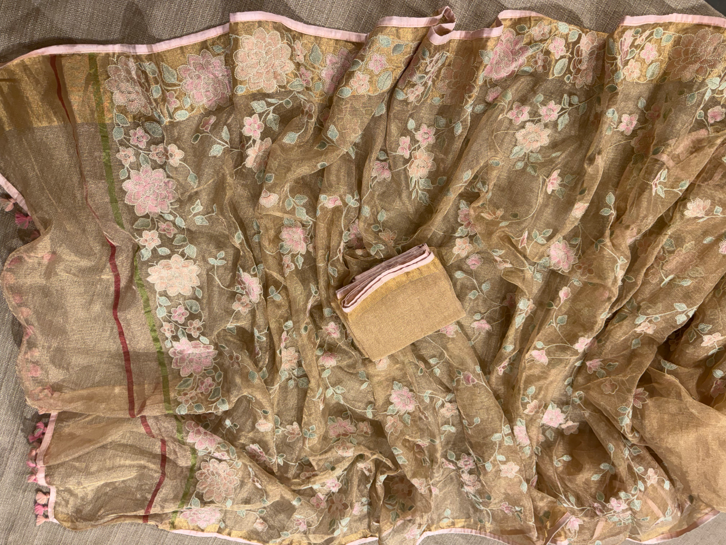Pure Handloom Gold Tissue Saree With Allover Multi Color floral Creeper Jaal Embroidery hemlined with baby pink salvage paired with plain gold tissue blouse with pink salvage .