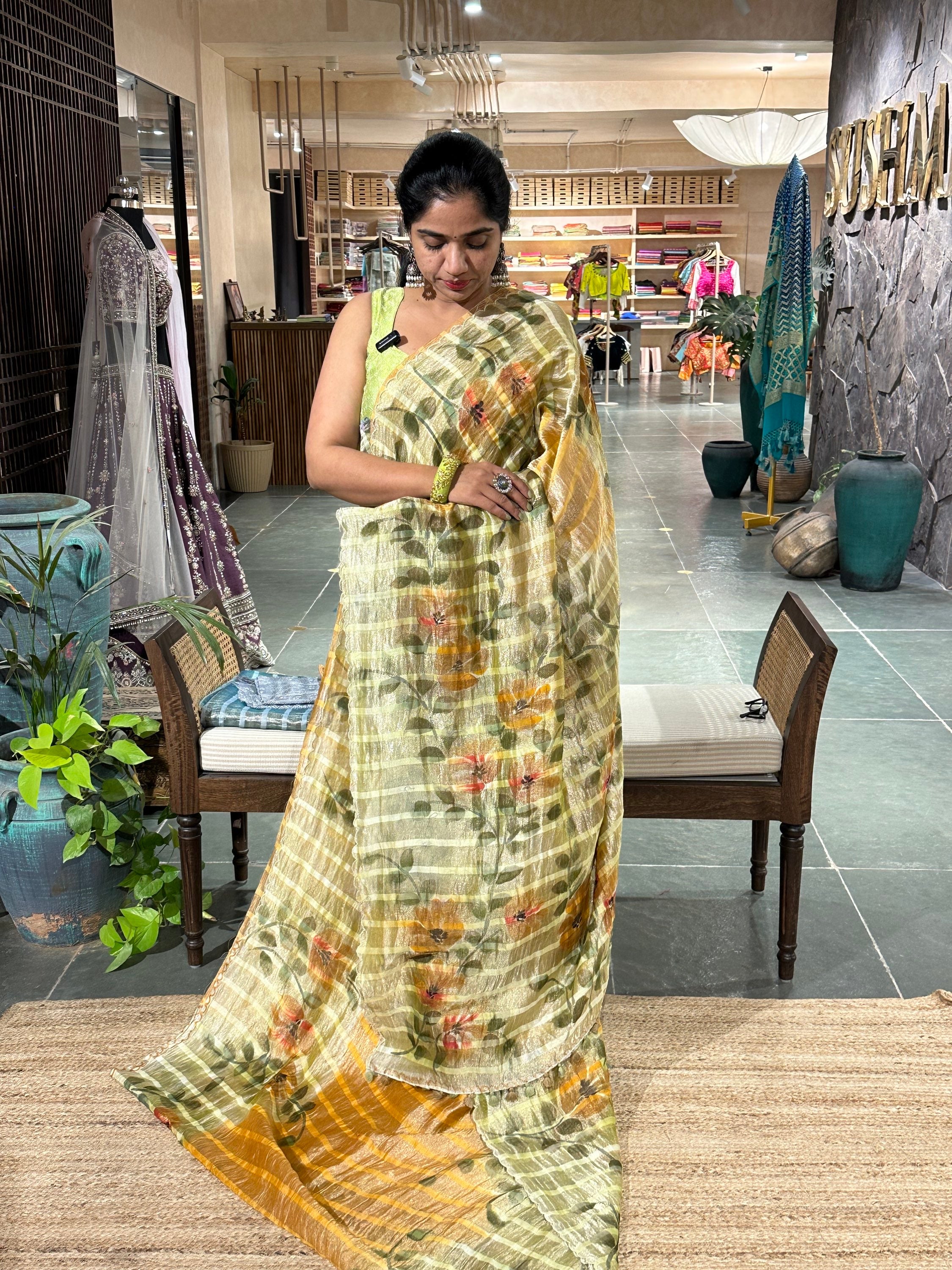 Kora Tissue handpainted Sarees with allover threadwork chikankari style ready to wear sleeveless blouse.