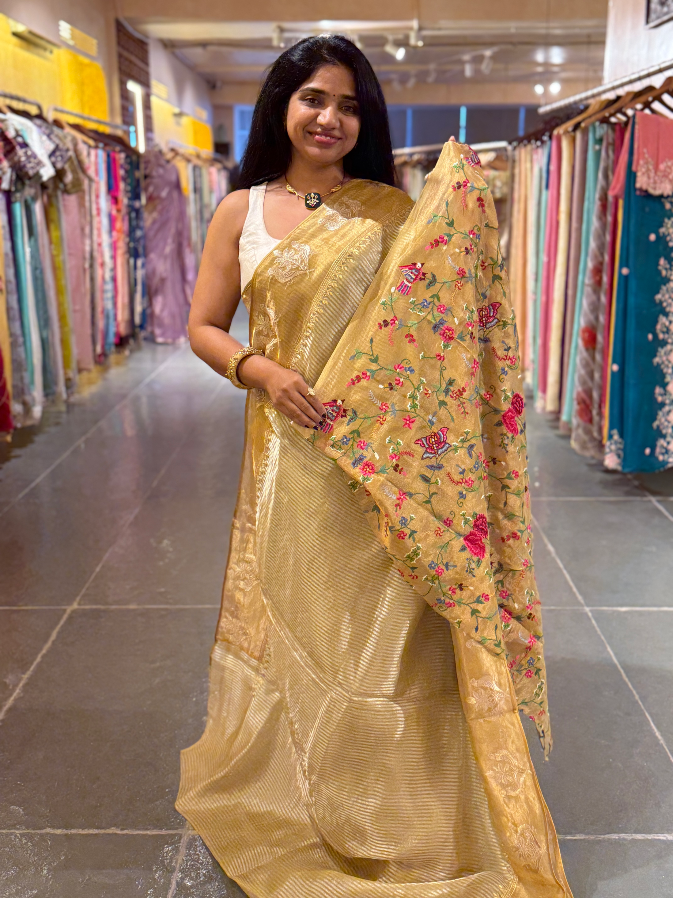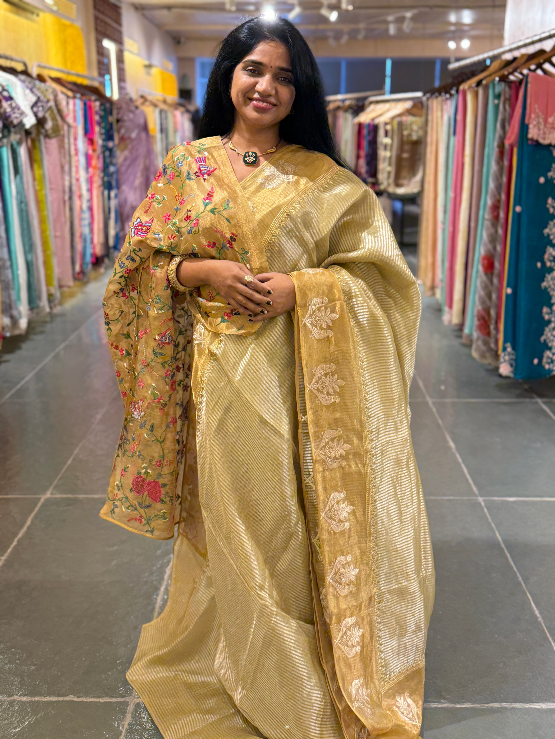 Lime Yellow Kora Tissue stripes saree wth tissue Embroidered Border