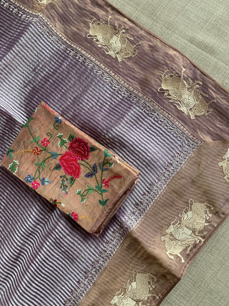 • Mauve Tissue Stripes Saree with Nandi Border & Tissue Petite Point Blouse