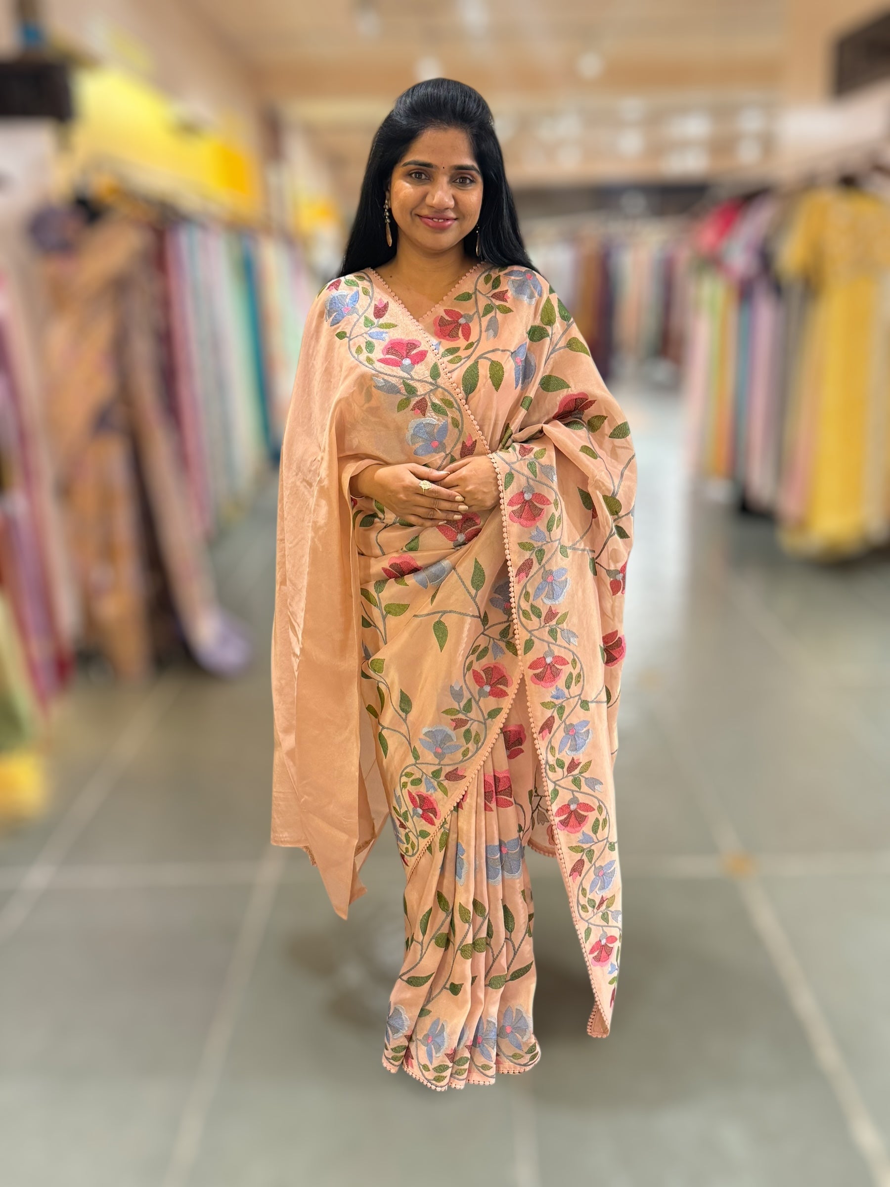 Tissue georgette saree with Paithani/Jamdani-inspired embroidery. Very falling and easy to drape. Comes with a self blouse with embroidered border.