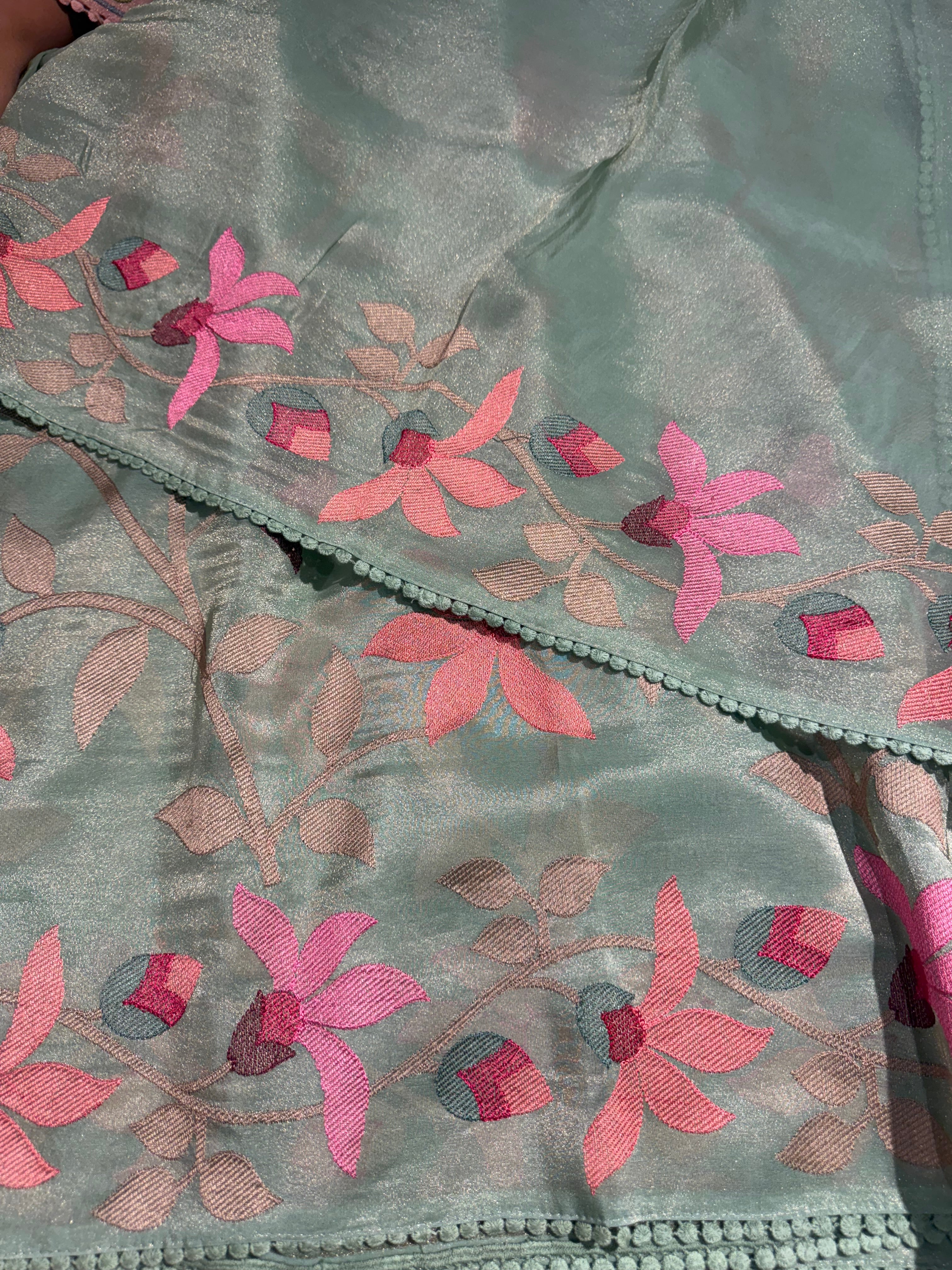Tissue georgette saree with Paithani/Jamdani-inspired embroidery and hemlined with crotia lace . Very falling and easy to drape. Comes with a self blouse with embroidered border.