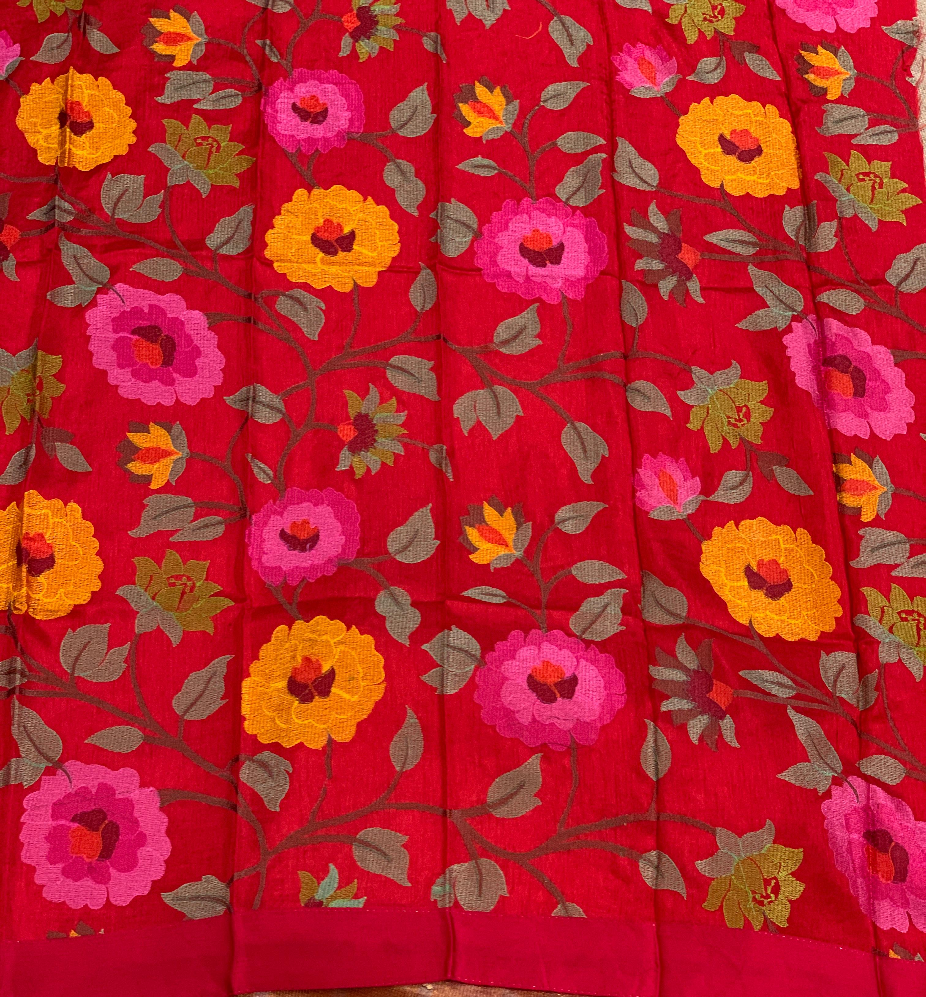 A Bright Red pure handloom Banarasi tissue saree embellished with delicate sequins all over, adding a soft, elegant shimmer. The drape is beautifully completed with luxurious pure Mahru satin borders.