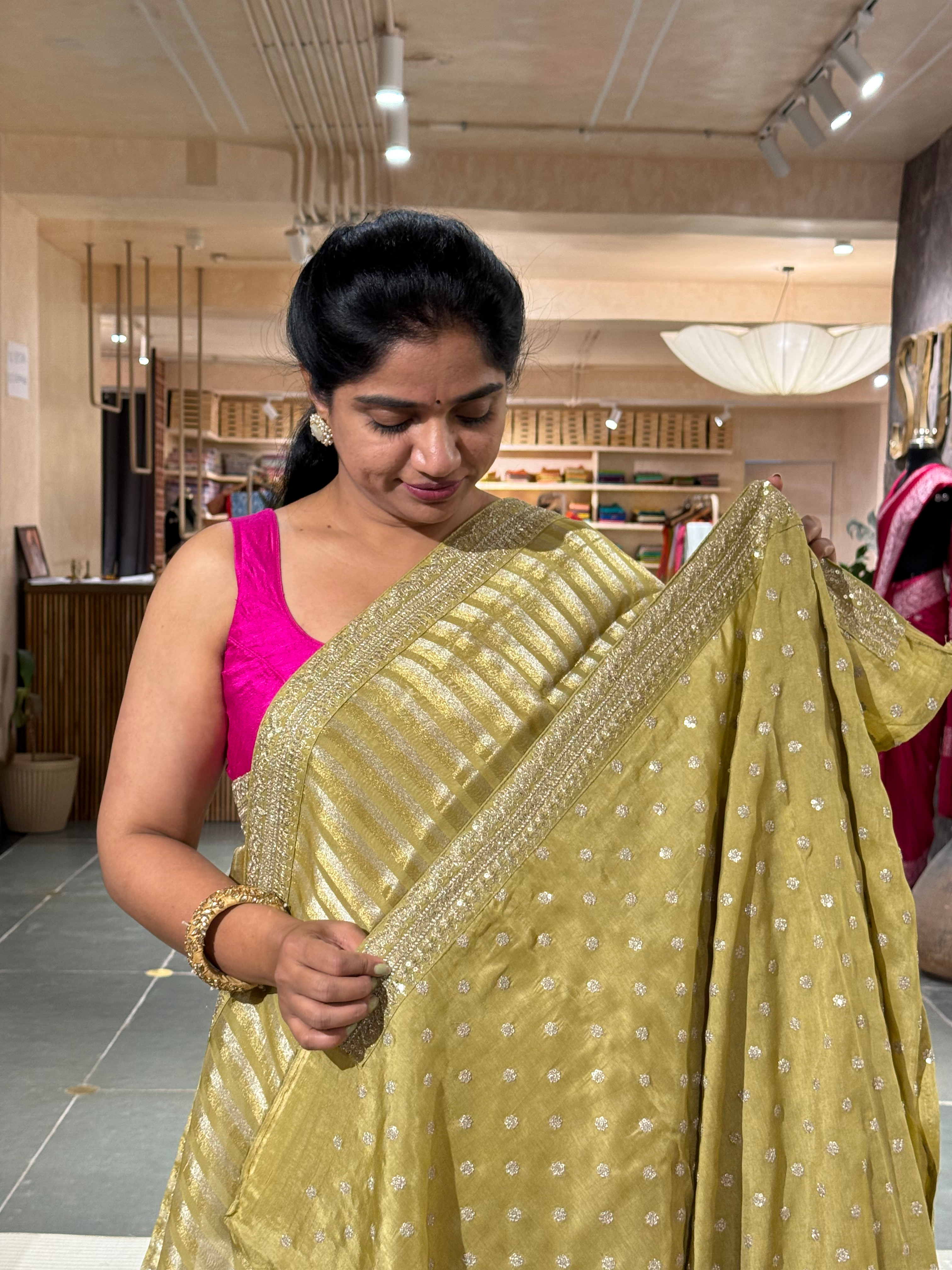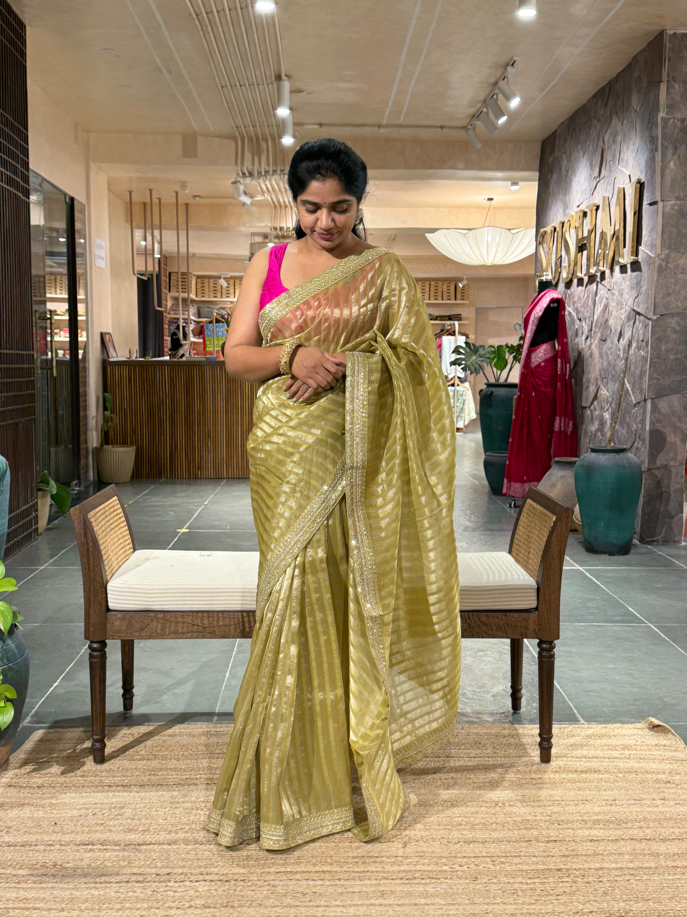 • SKTSA601 : Pista Kora Tissue Stripes Saree wth Sabhyasachi borders & Blouse