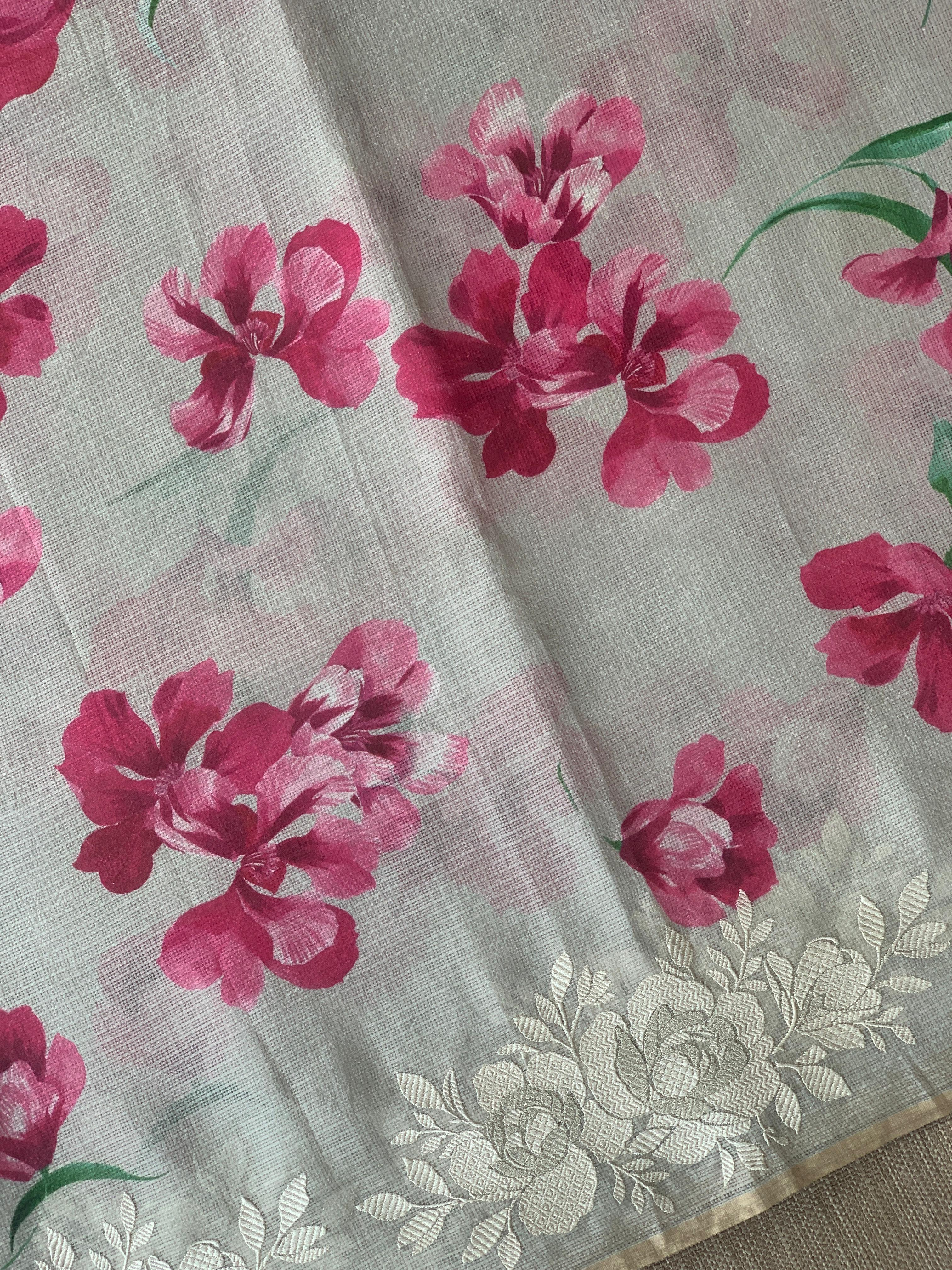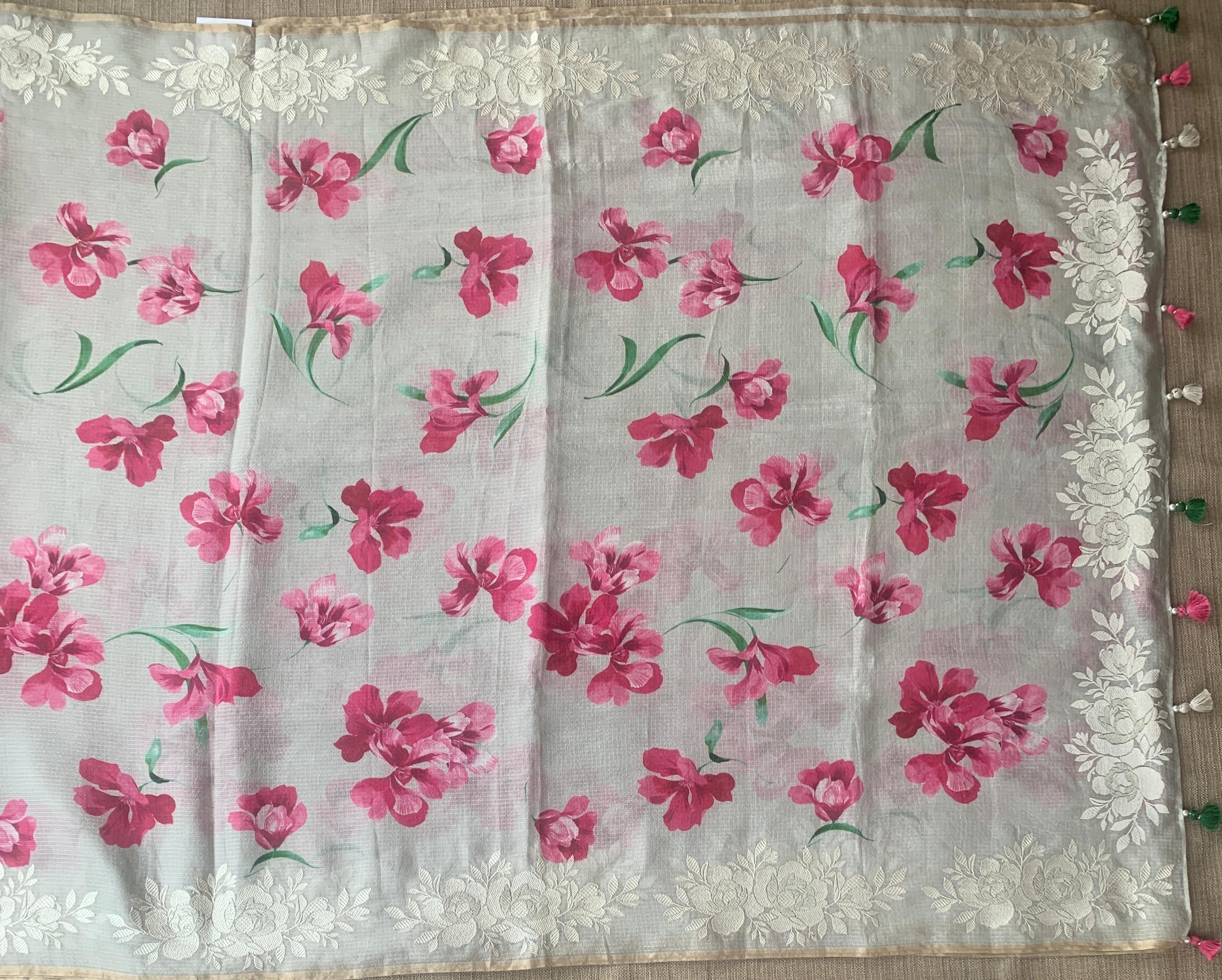 • Dusty Grey Designer printed Silk kota saree with floral embroidered border