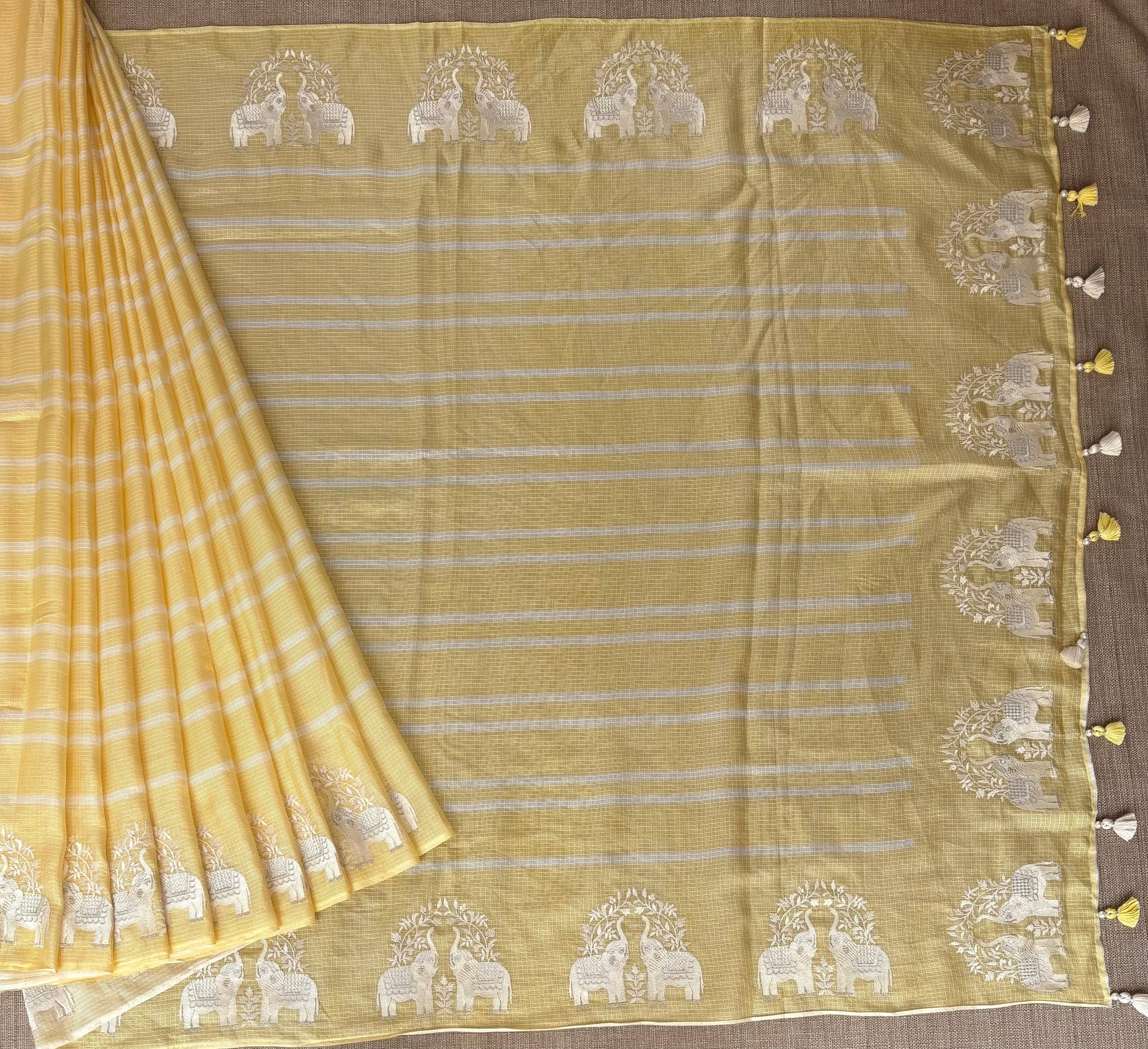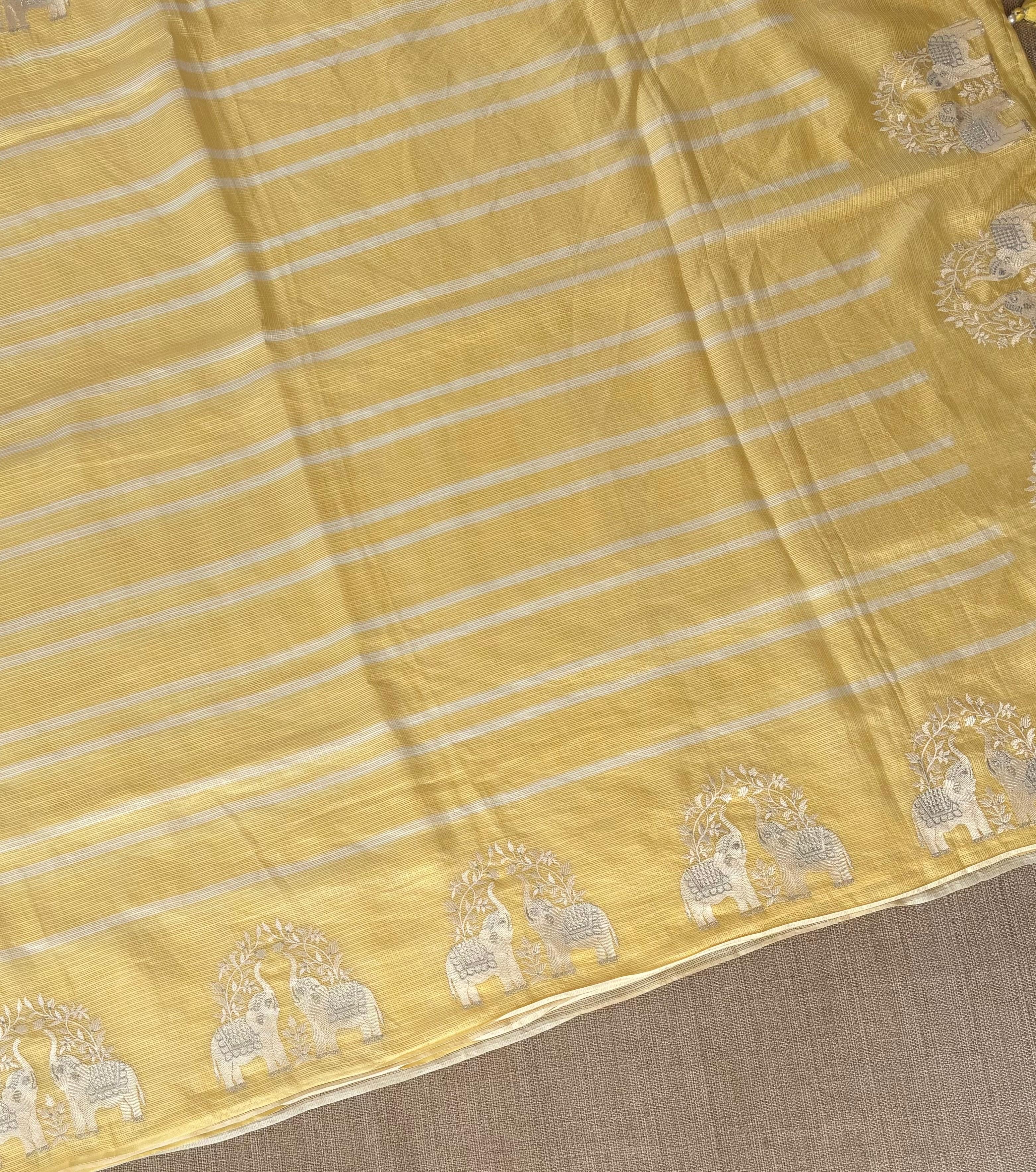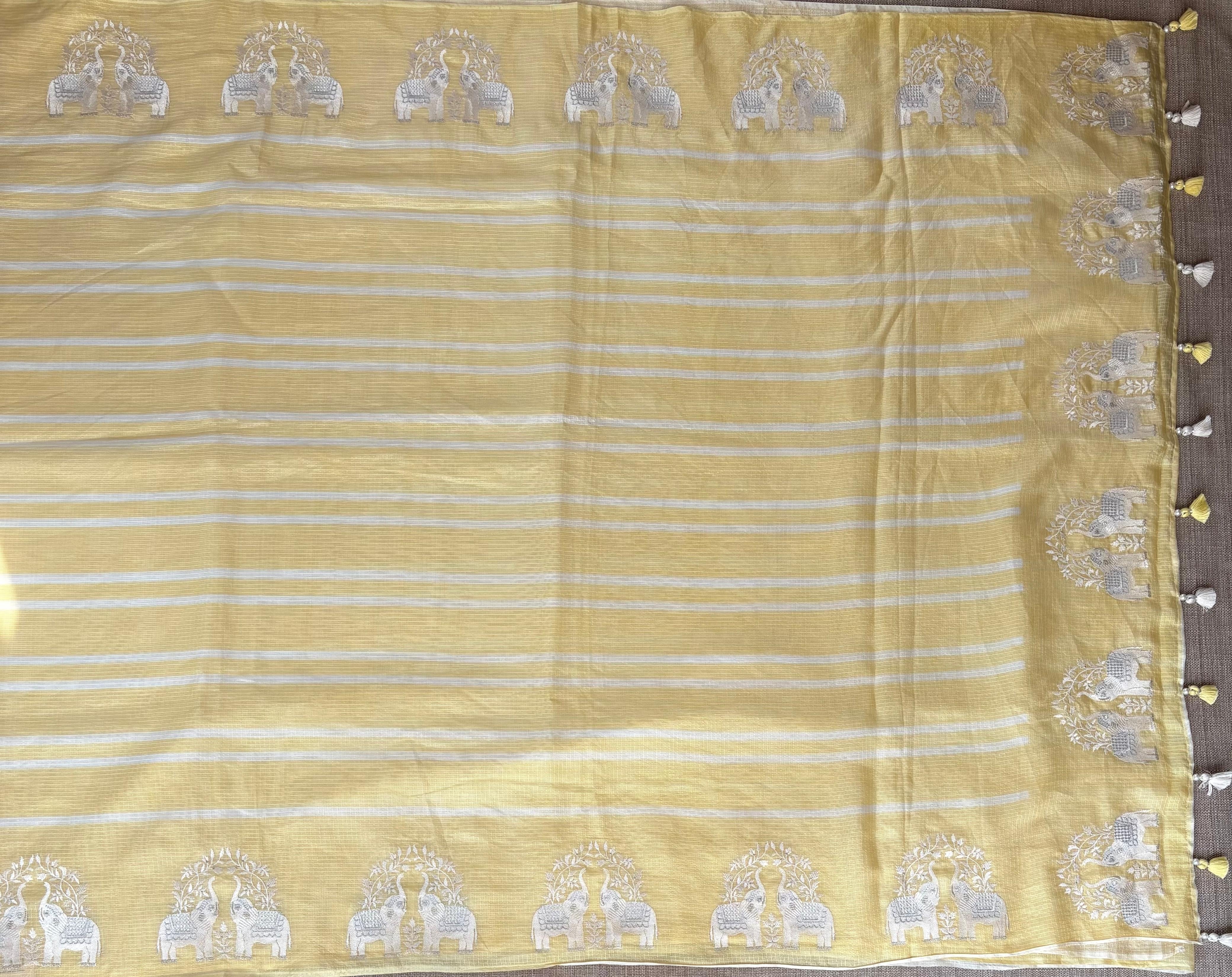 Pastel Yellow Designer Silk kota saree with stripes body in different shades of yellow and double elephant embroidered border paired with polka dot printed blouse with elephant embroidery matching to the saree border.
