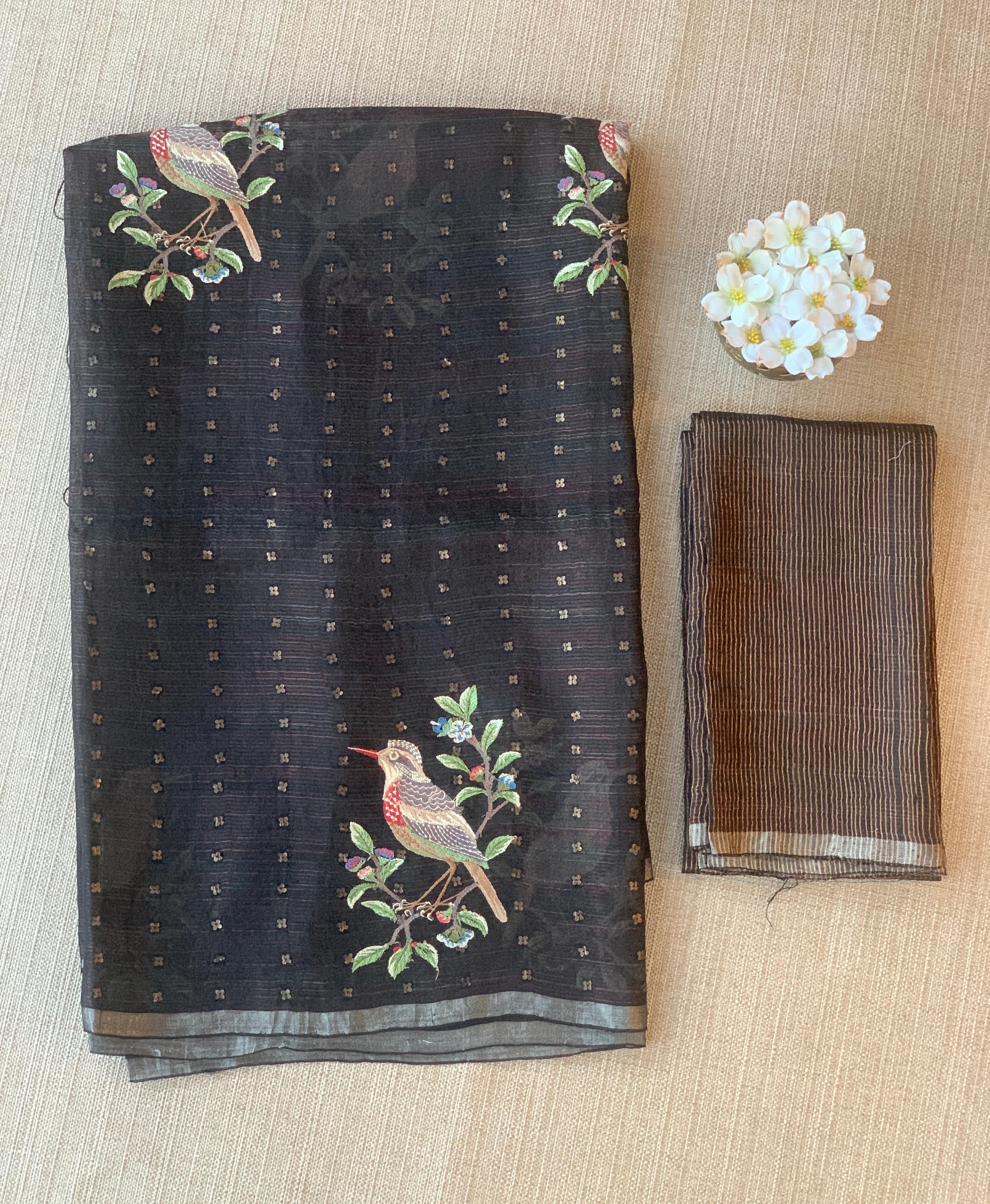 The body is adorned with delicate bird embroidery motifs perched on branches — a touch of nature captured in threadwork.