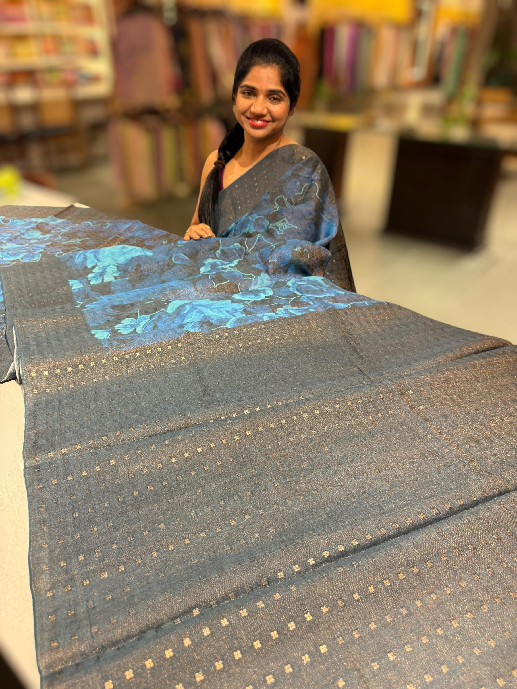 Tussar Tissue Printed Saree with embedded sequnce border and pallu . Blouse is plain tussar tissue .