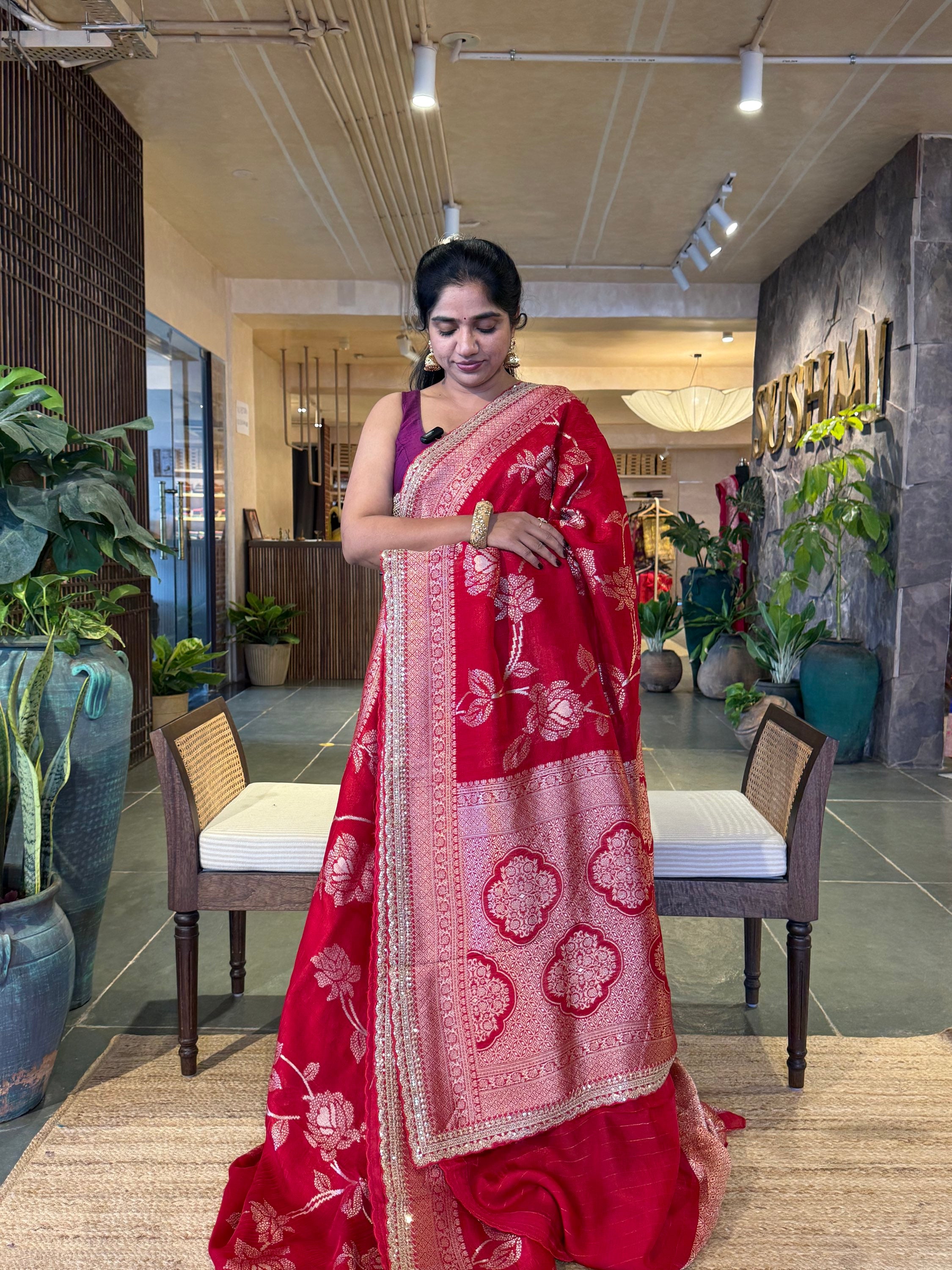 • Red Tussar Khaddi Saree wth Allover weaving & sabhyasachi borders STKM15