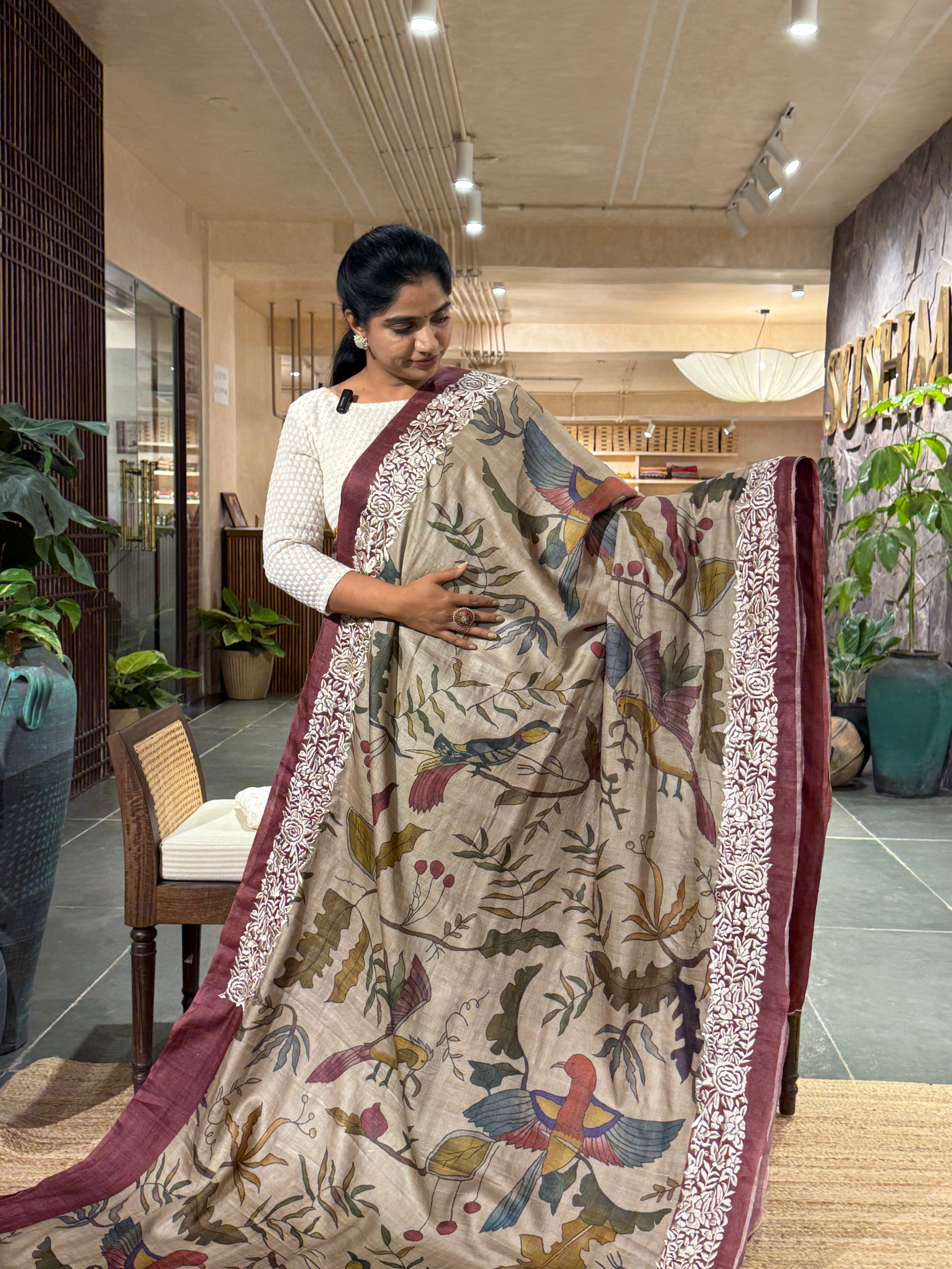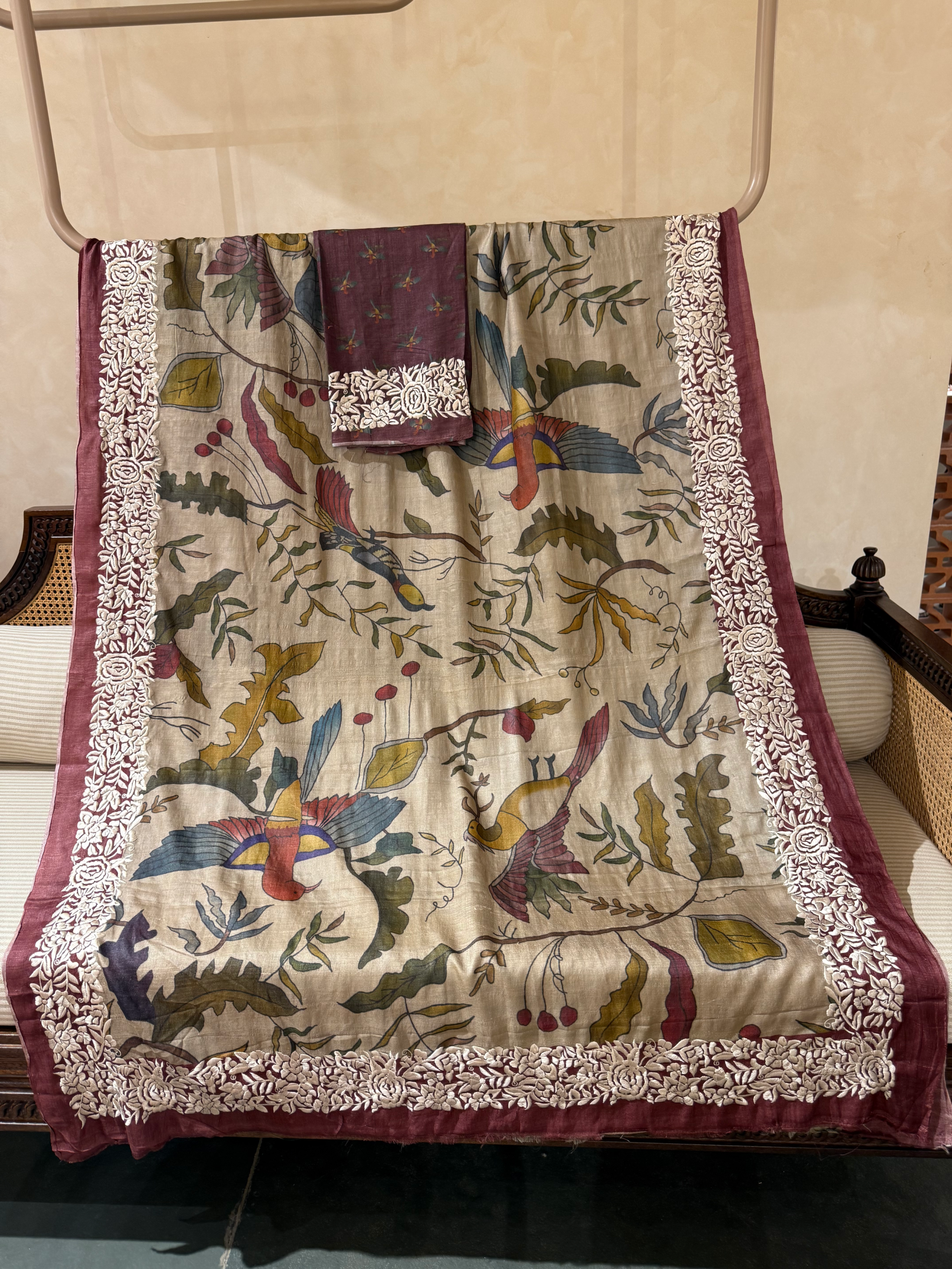 Pure Tussar Fusion Saree with Pen Kalamkari style Print and highlighted with Parsi Gara Embroidery .