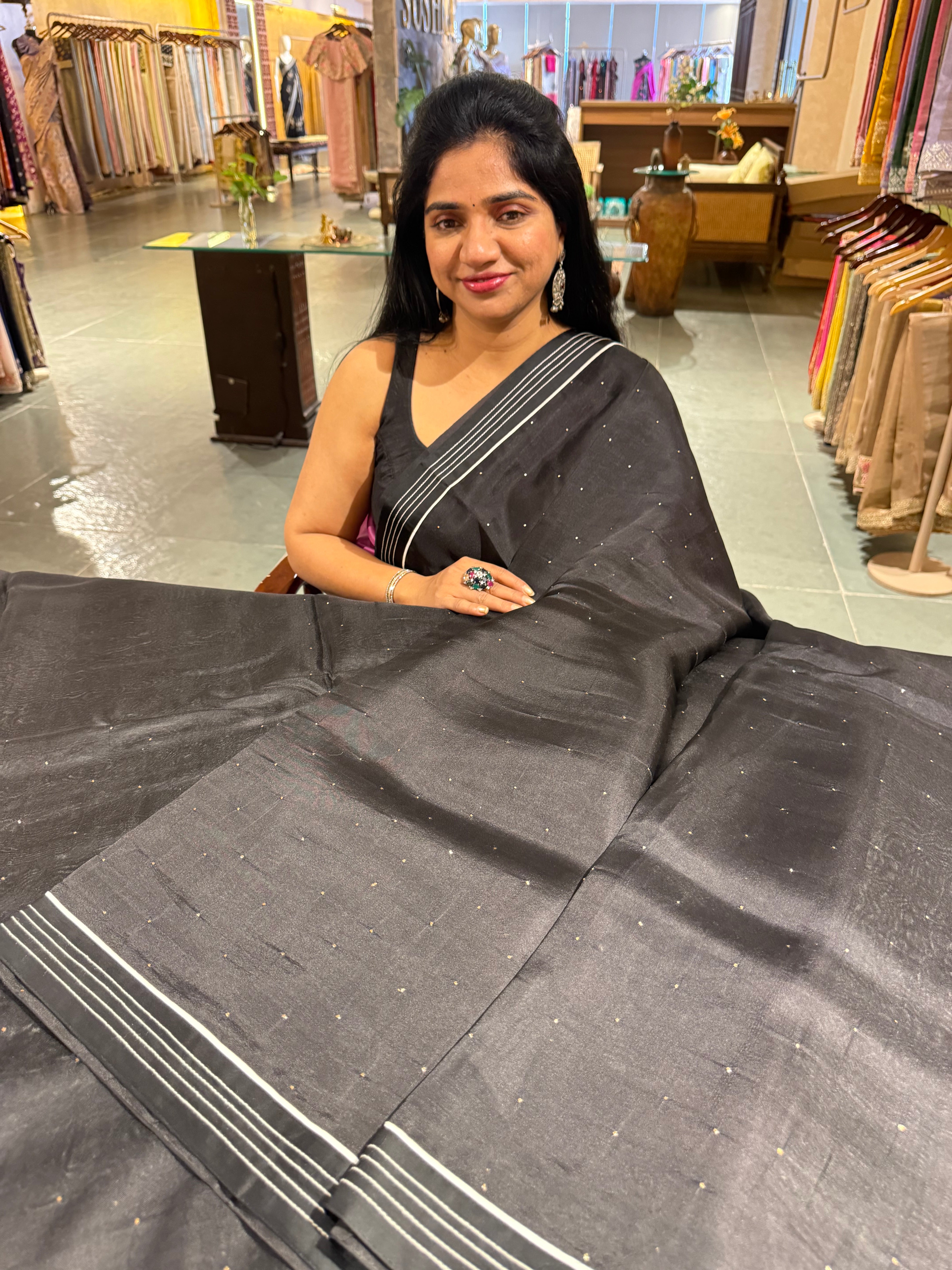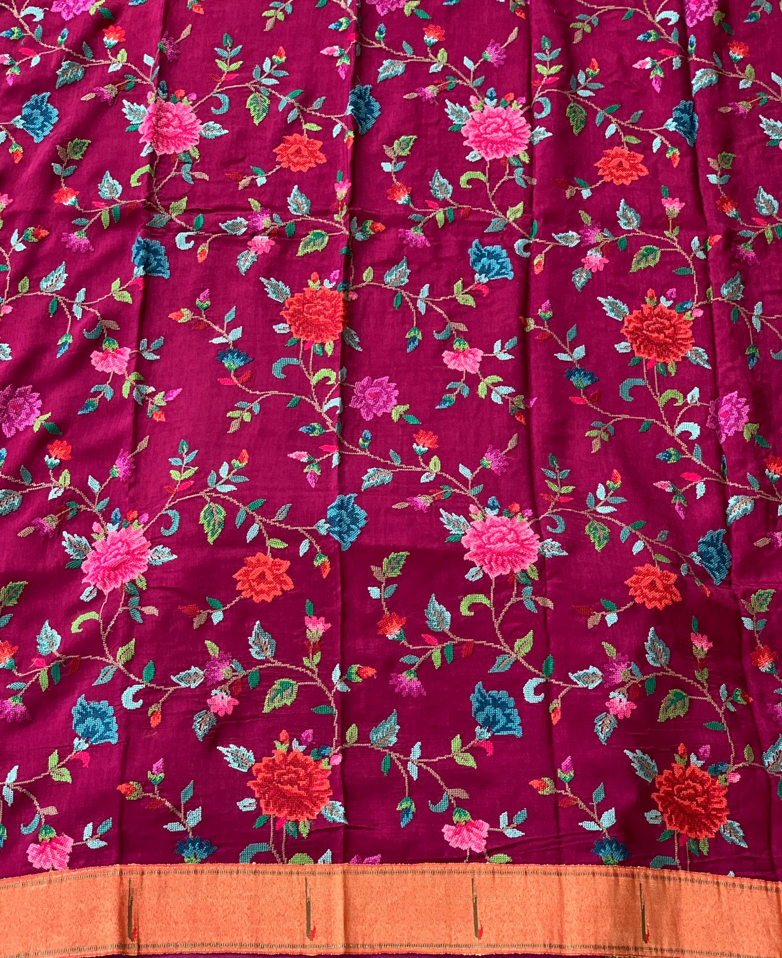 Wine Handloom Tussar Saree with pita embroidered sequnce scallop border paired with kora blouse with allover petite point embroidery hemlined with pure handloom single muniya tissue border