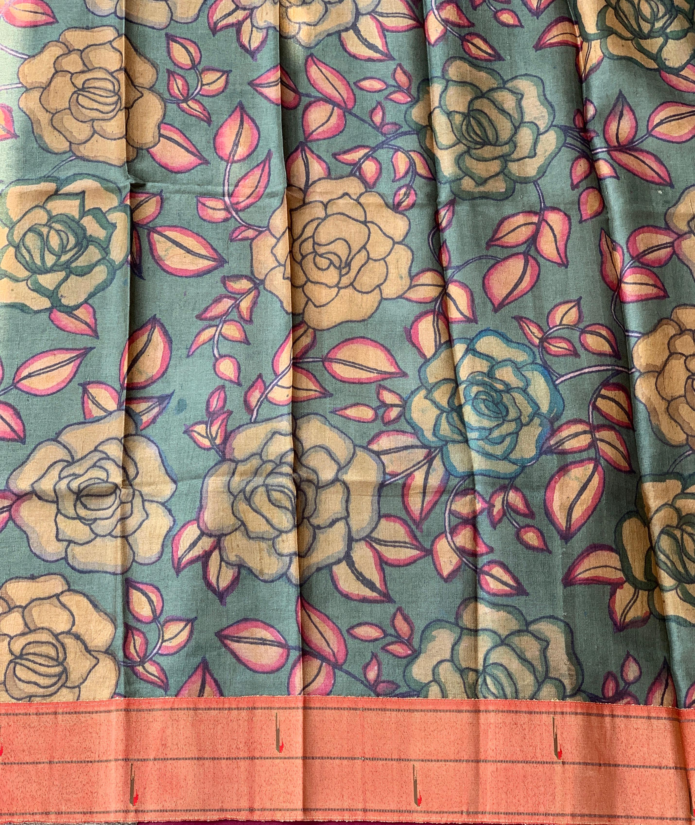 Burgundy Handloom Tussar Saree with pita embroidered sequnce scallop border paired with pure tussar blouse with Pen kalamkari style print hemlined with pure handloom single muniya tissue border