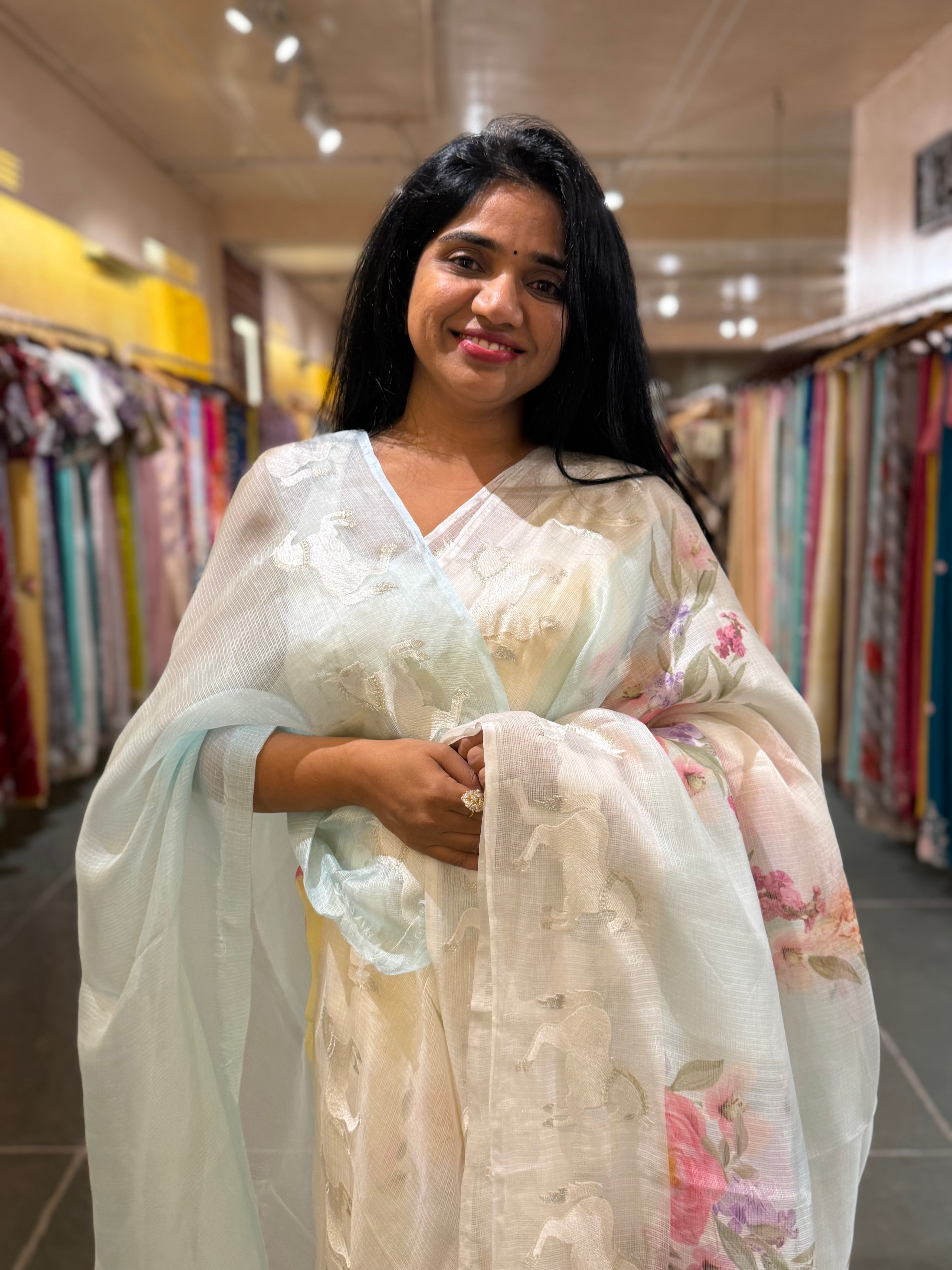 • Baby Blue & white Silk kota with floral print & horse embroidered borders
