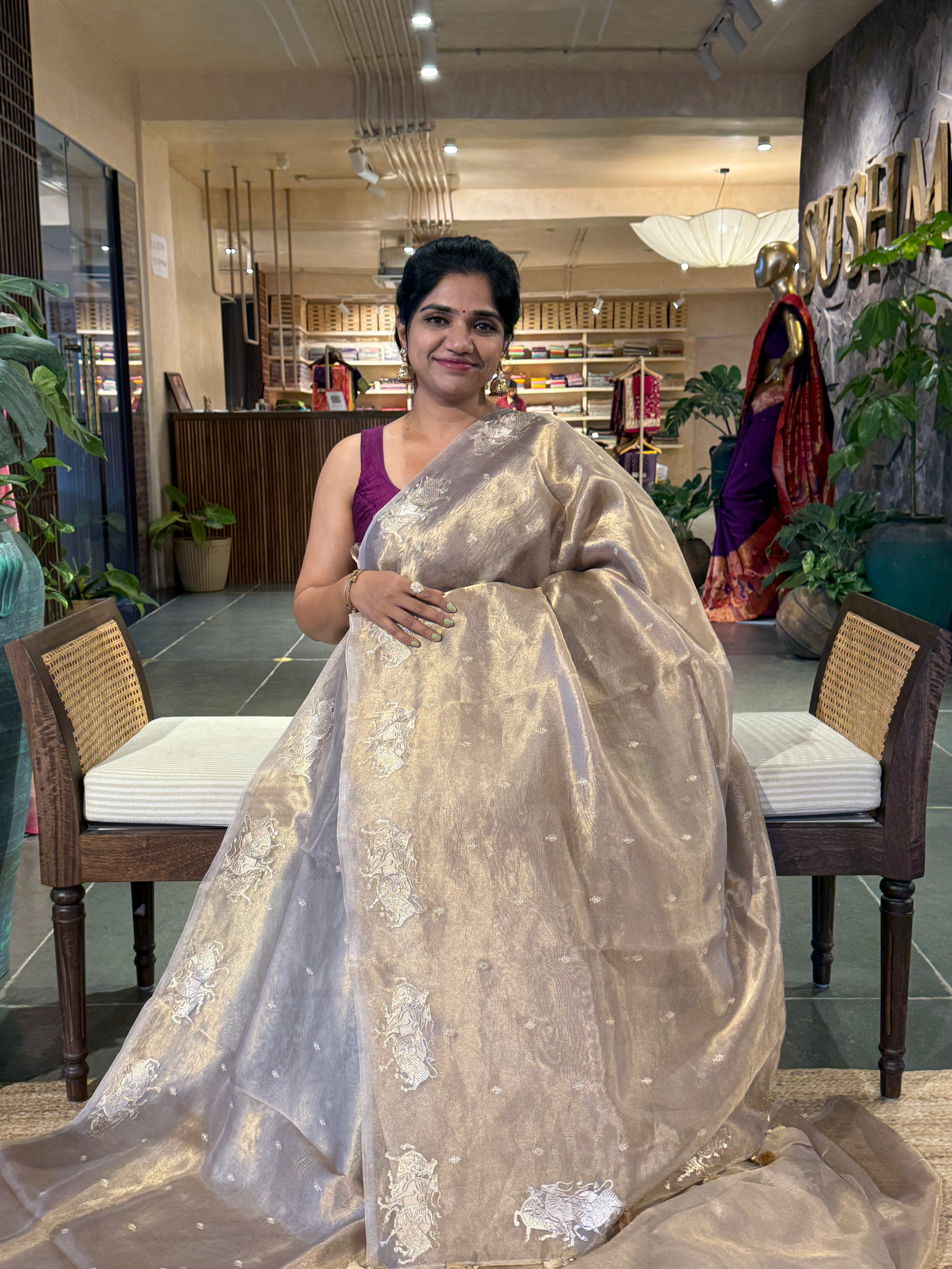 • Beige Gold Tissue Saree with Nandi Embroidery & Stripes Tissue Blouse