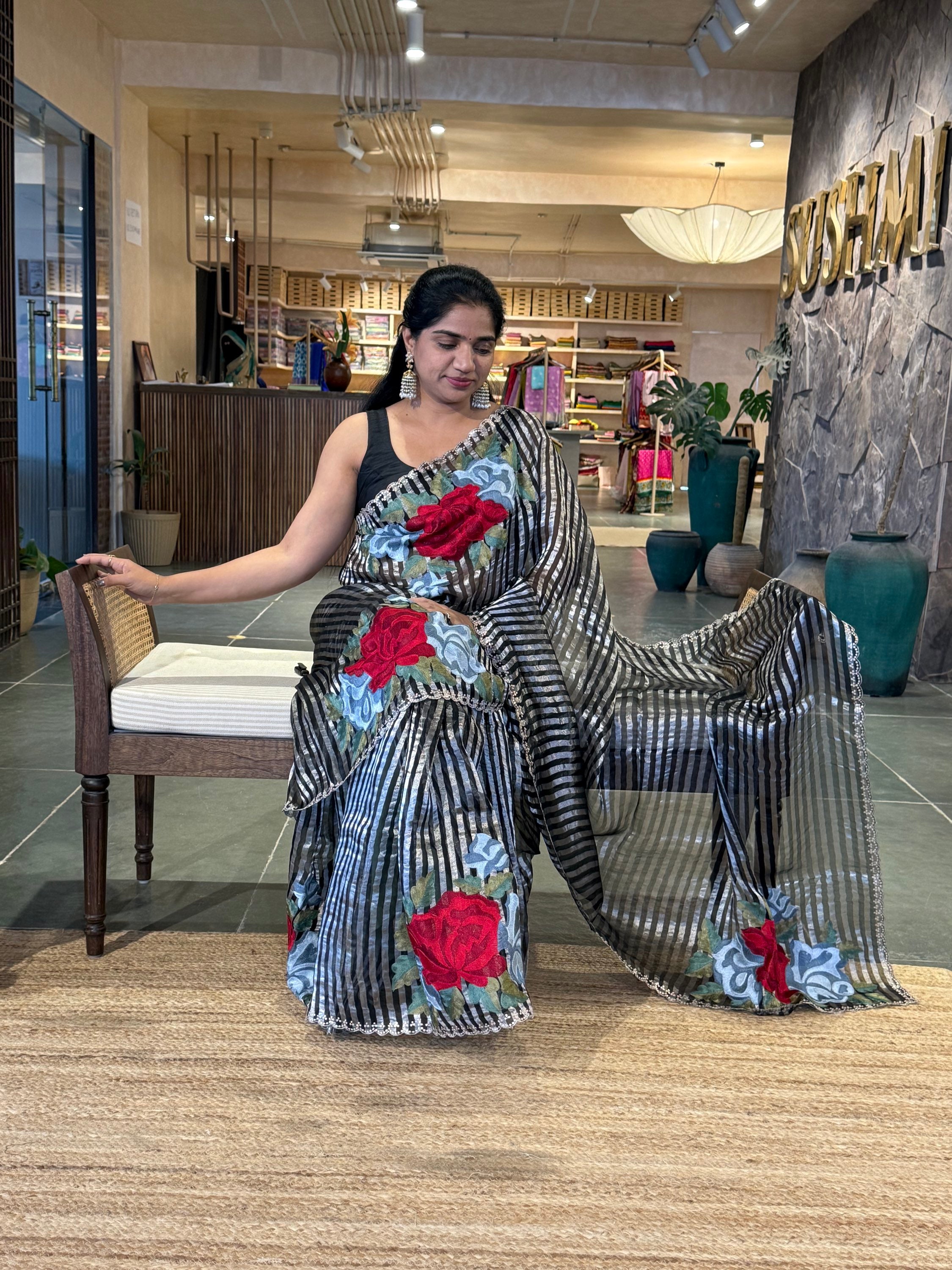 This exquisite tissue silk saree showcases striking black and silver stripes, elaborate floral embroidery, and an elegant silver zari pita work border with scalloped edges.