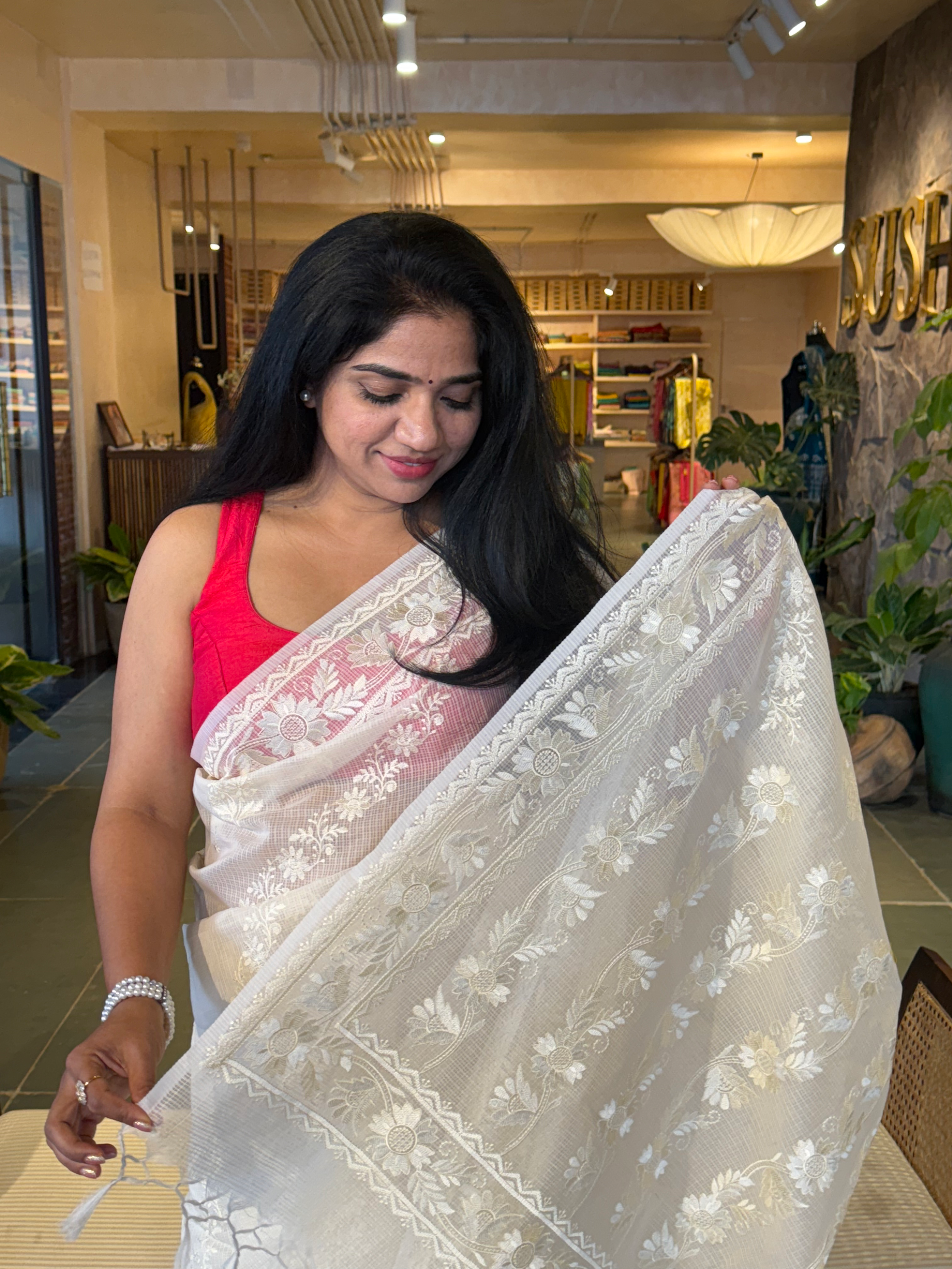 Kota Cotton Chikankari Embroidered Saree paired with Shaded Green Sabhyasachi style Printed Organza blouse with allover pitta work