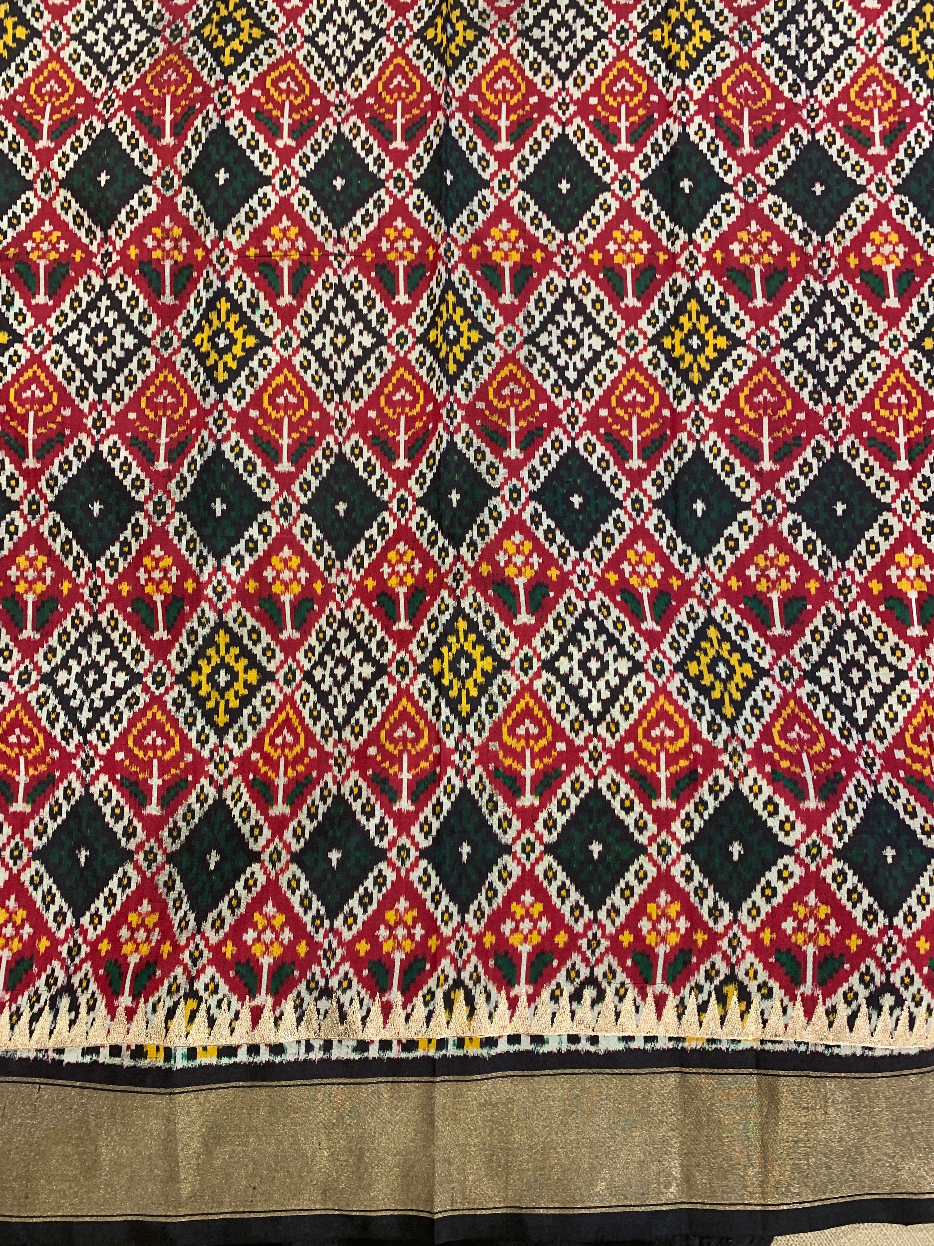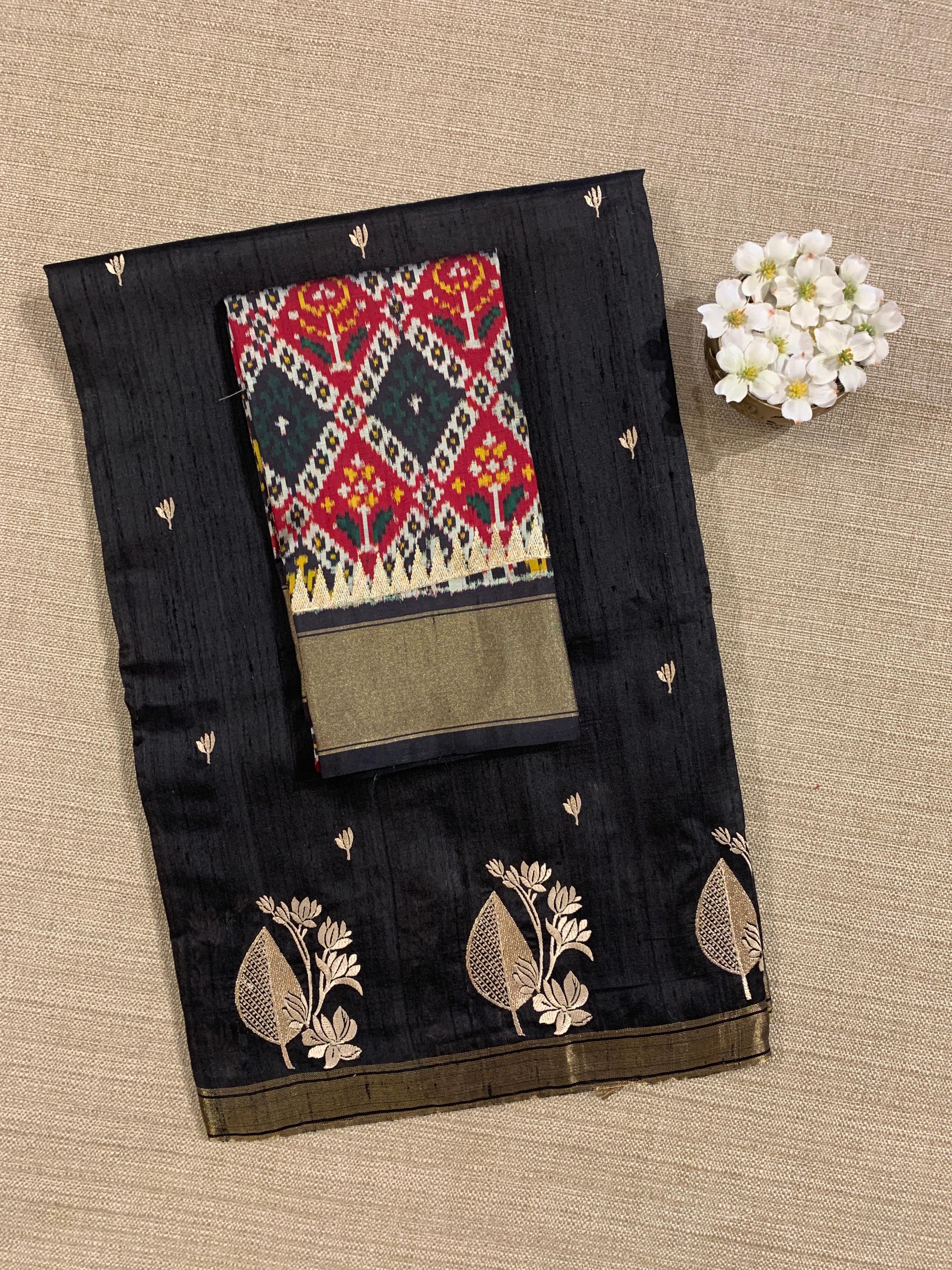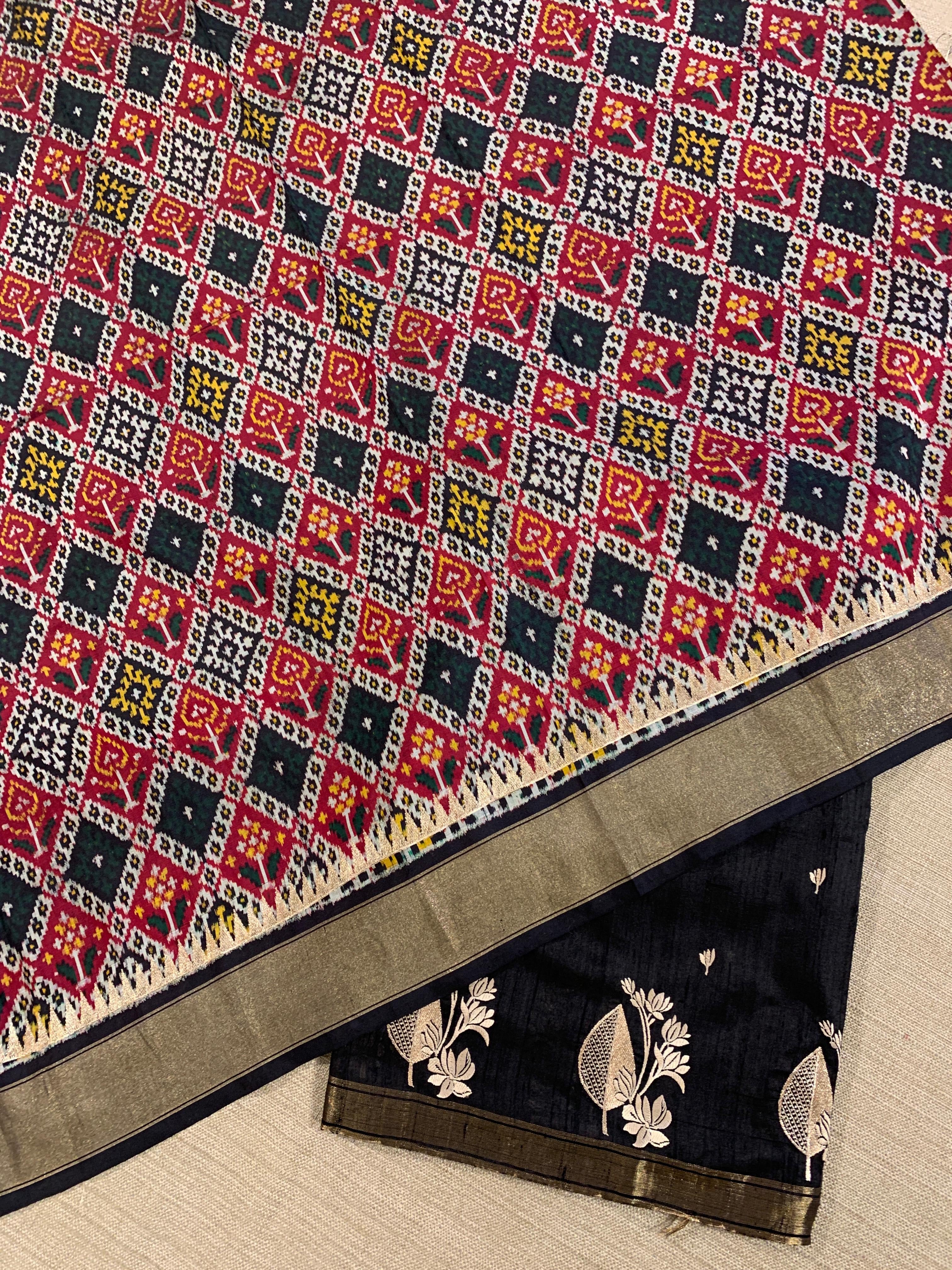 Pure Handloom Raw Silk Saree in vibrant colors and stunning embroidery paired with Ikkath Patola silk Blouse . Blouse is highlighted with temple style embroidery.